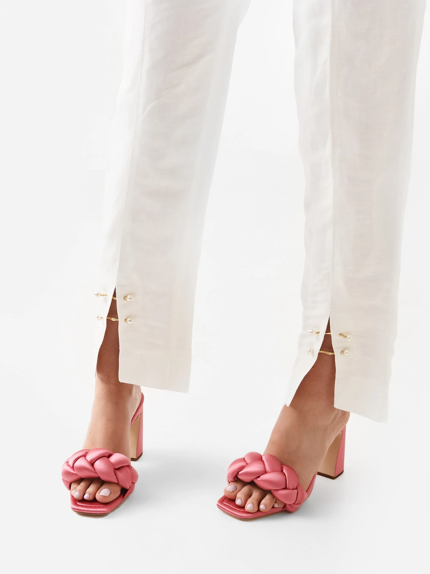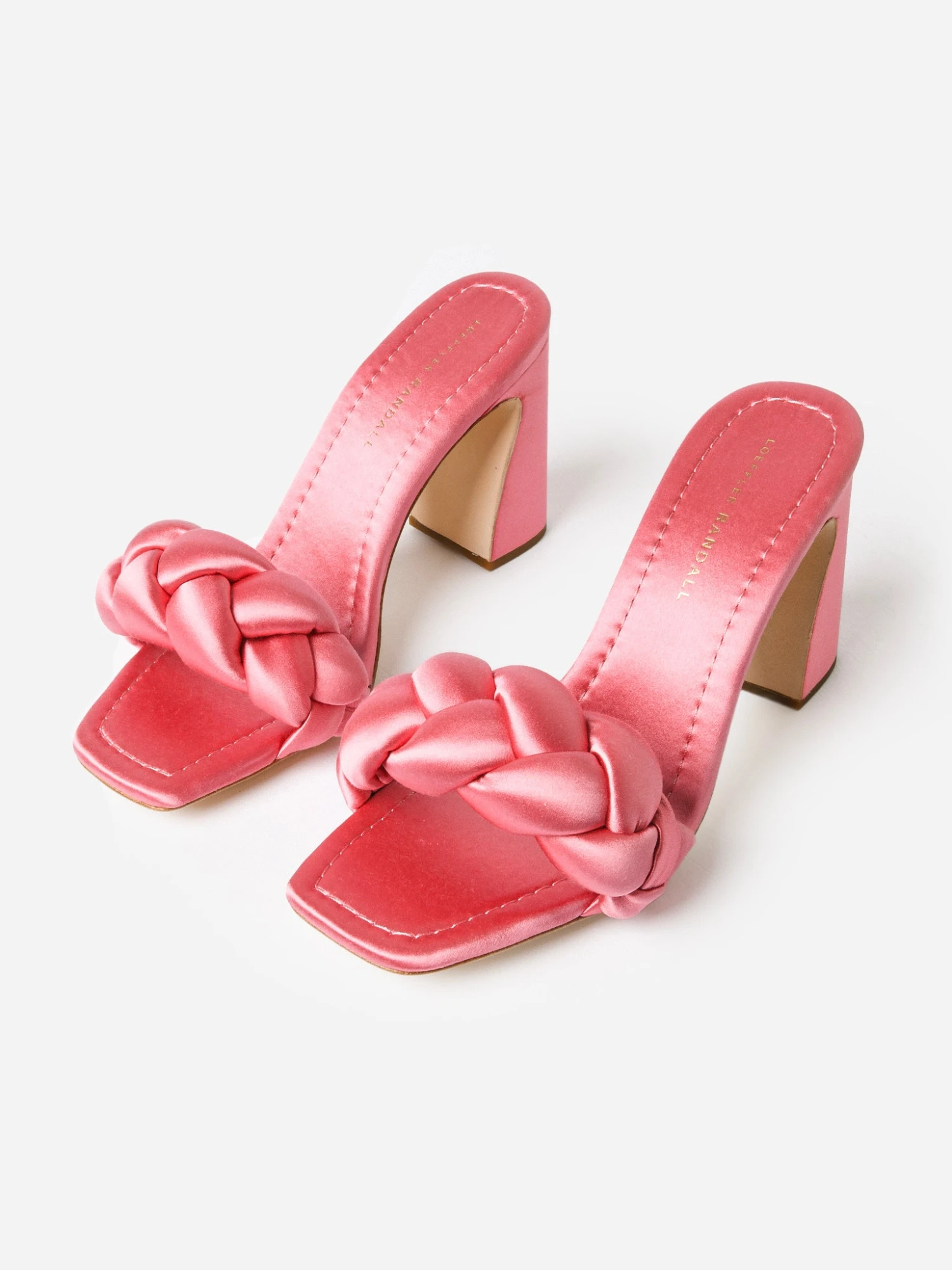 Satin heeled mule with a wide braided strap, curved heel, and slip-on construction.