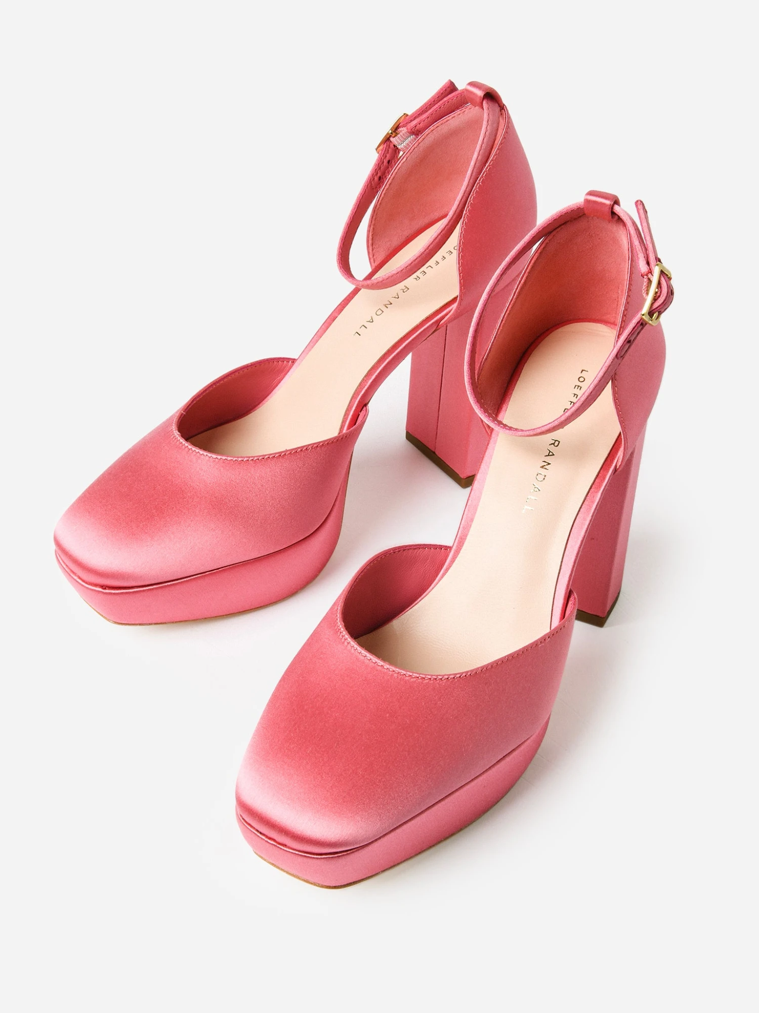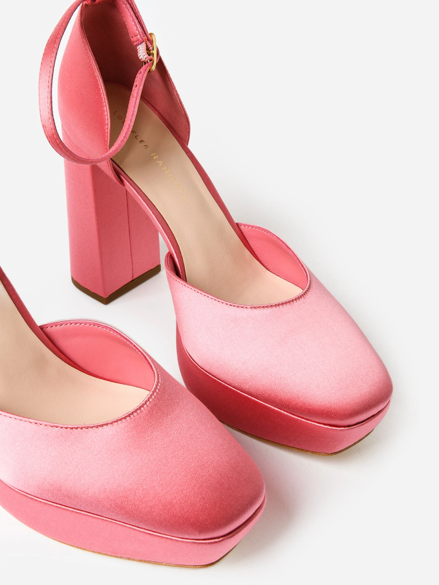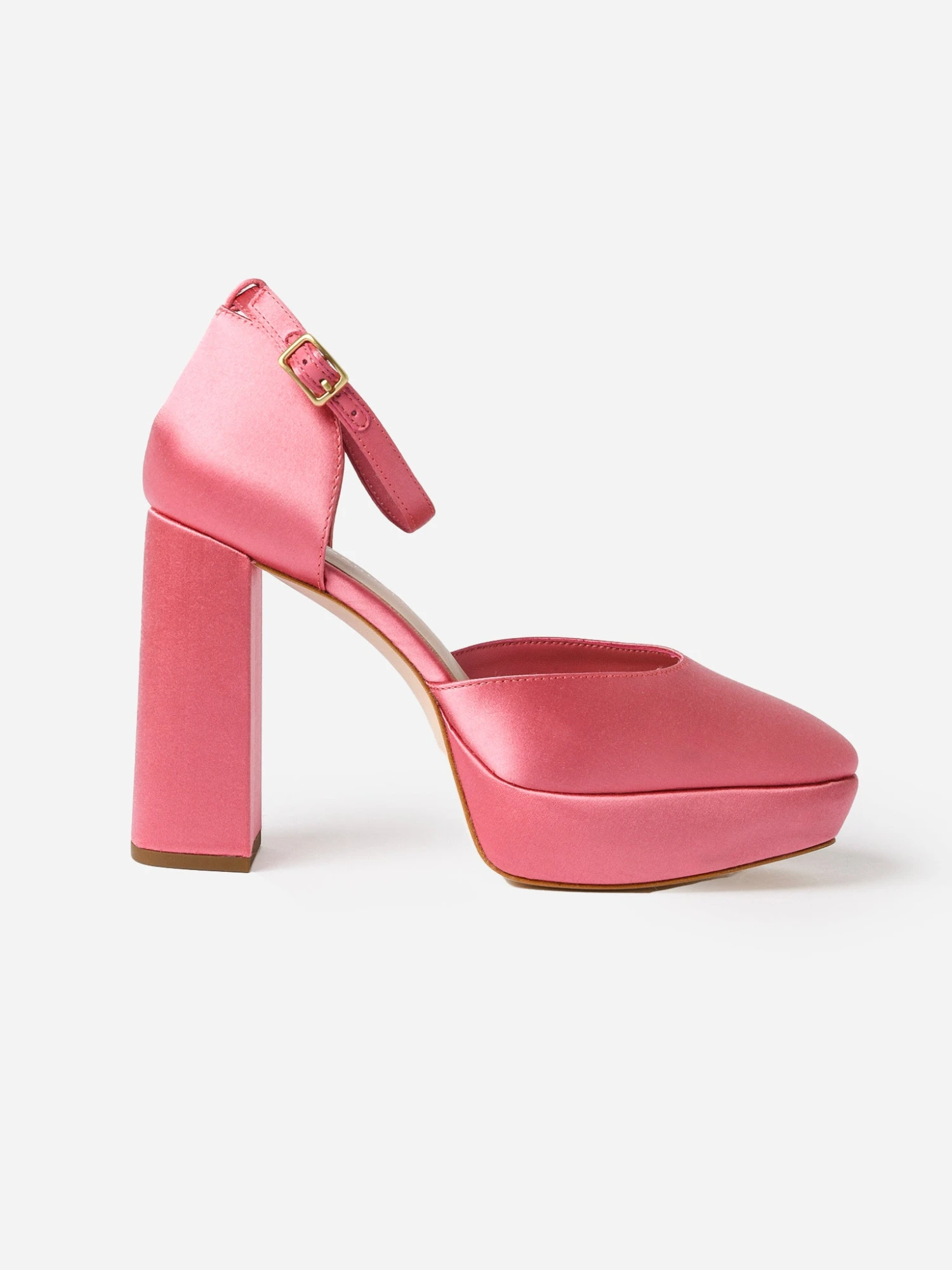 FEATURES:Platform HeelRound ToeAdjustable Ankle StrapPadded FootbedUpper: 72% Viscose, 28% SilkOutsole: 100% LeatherHeel Height: 4.5 in. | Platform Height: 1.5 in.