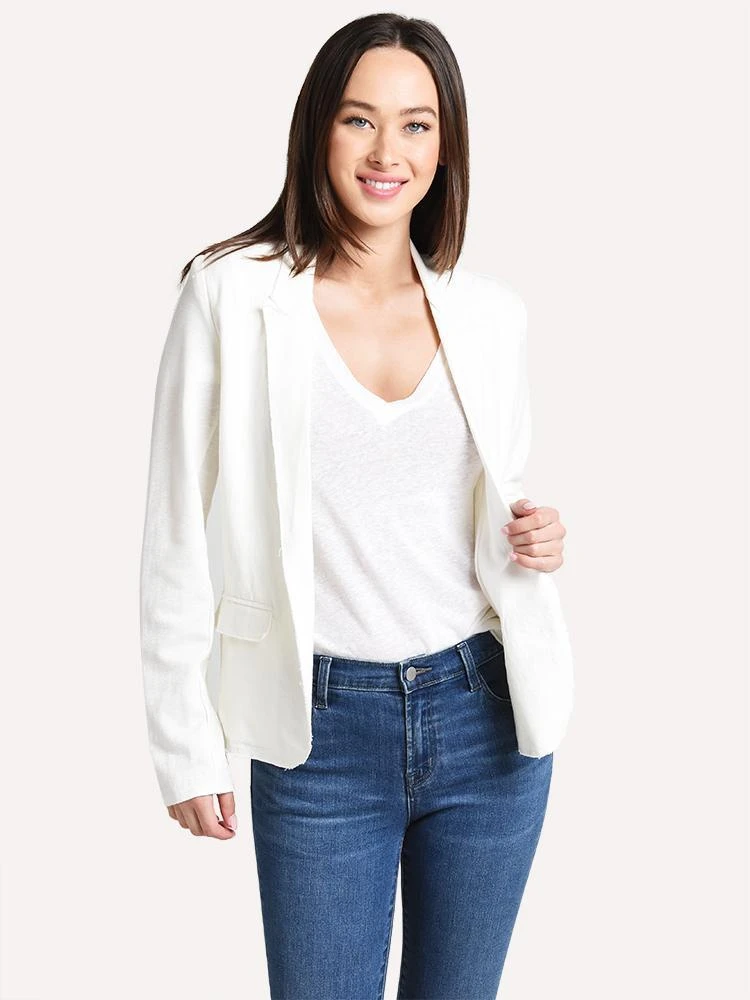 FEATURES:BlazerOpen SilhouetteTwo Flap PocketsLightweightOuter: 100% Linen; Inner: 100% CottonStyled with Brochu Walker tee Style # LVK2757, J Brand jeans sTyl # JB000361 and Binge sandals style # KAIPS. Model is wearing size Small blazer, size Small top and size 25 jeans.