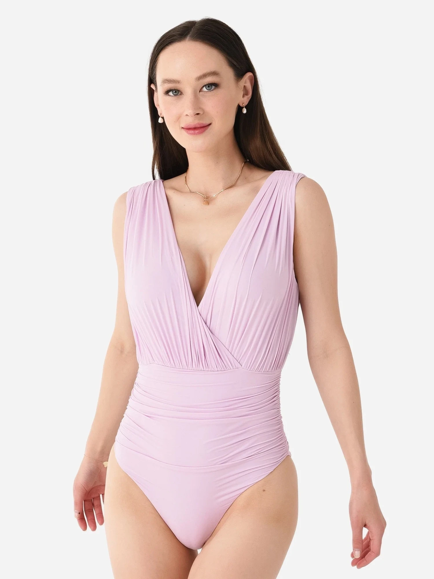 FEATURES:One-Piece SwimsuitV-Neckline, V-BackWide StrapsRuched DetailingModerate CoverageMoisture-WickingQuick-DryingShape RetentionSmooth Fabrication70% Polyamide, 30% ElastaneClassic FitModel is wearing size Small swimsuit.Model’s Measurements: Height: 5’10.5″ | Bust: 32C | Waist: 25″ | Hips: 36″ | Dress Size: 4 (US)
