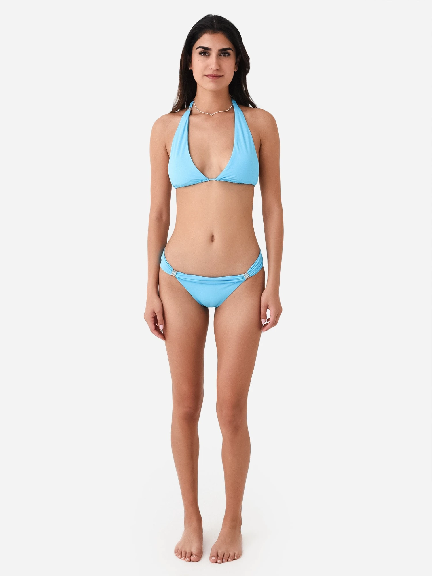 Low-rise bikini bottom with gathered details and moderate coverage.