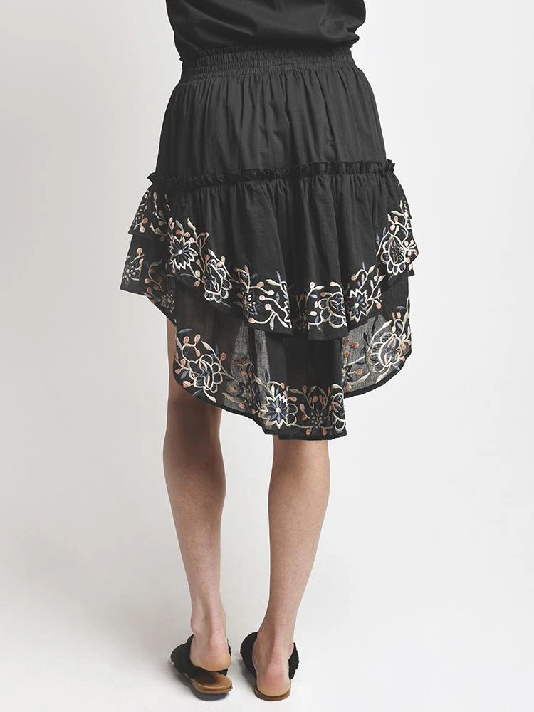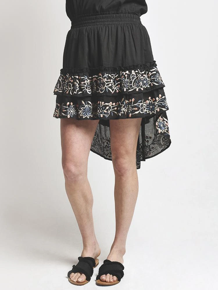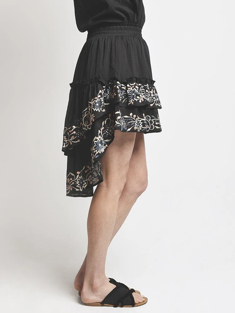 FEATURES:Hand wash coldUnlinedSmocked elastic waistTiered ruffled asymmetrical hemEmbroidered detail along hemWaist to shortest hem measures approx 14 and to longest hem approx 25 in lengthStyled with Misa Top Style # FETP62100. Model is wearing size small top and skirt.