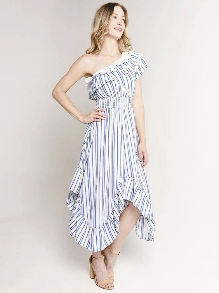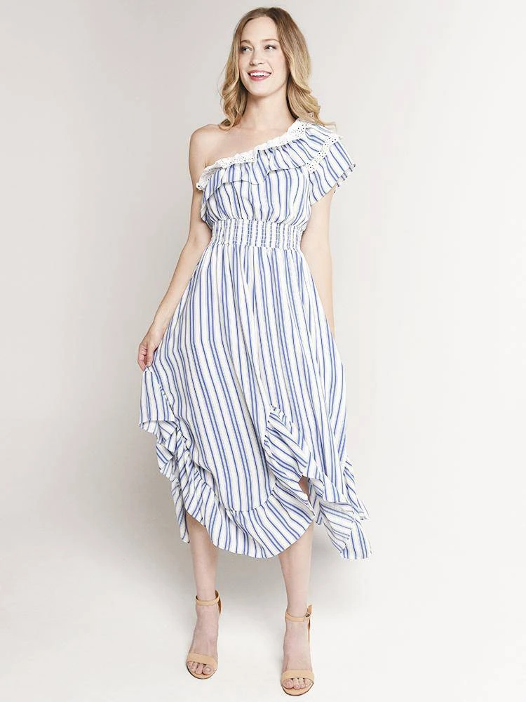 FEATURES:100% Linen ModalDry CleanMade in the USAOne shoulderRuffle Trim Model is wearing size 2 dress.