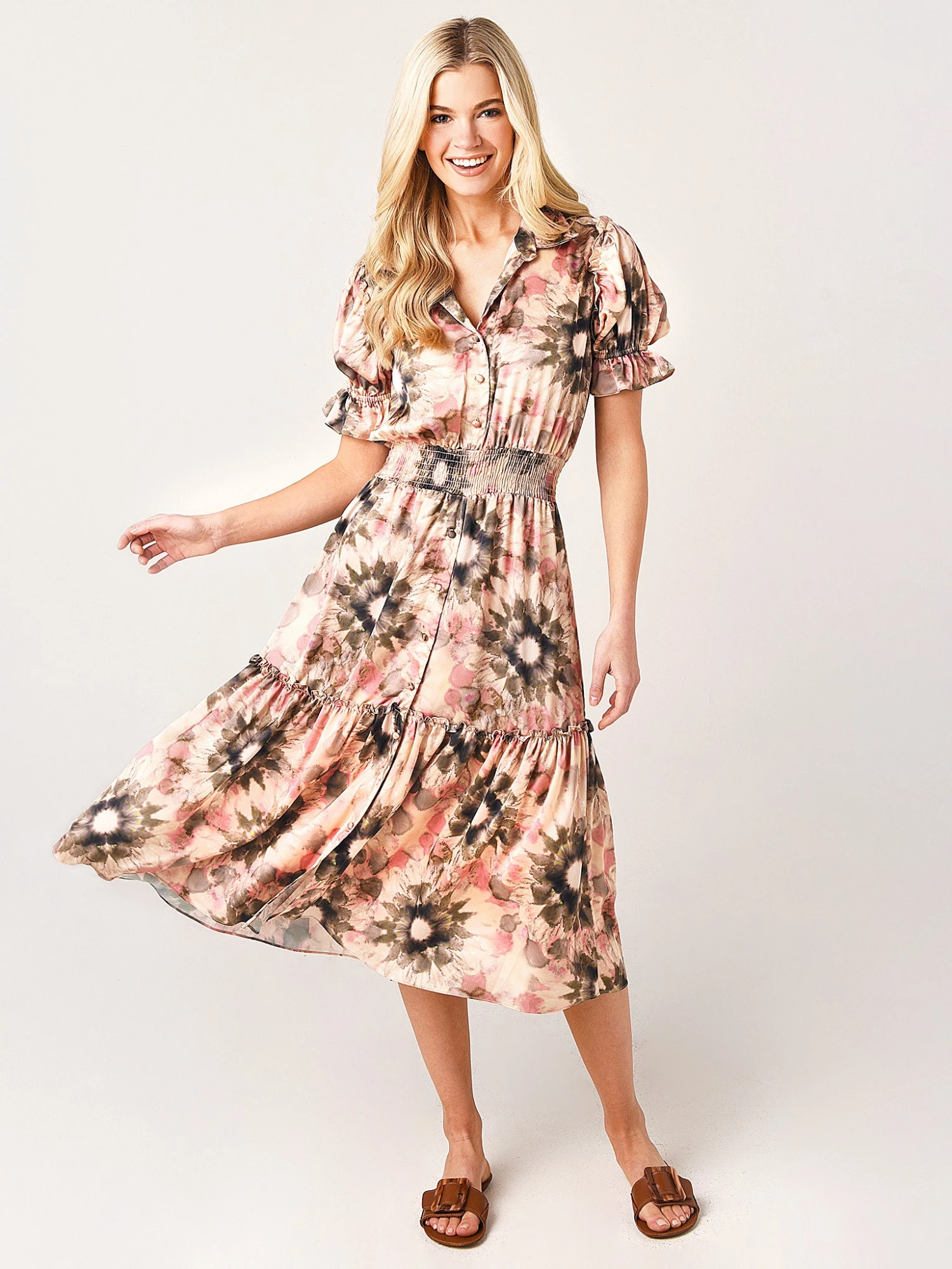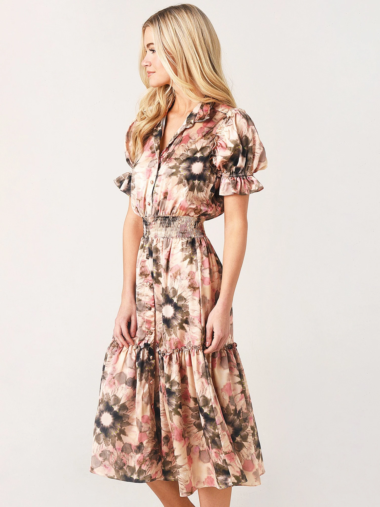 FEATURES:Midi DressFold-Over CollarButton-Down PlacketAll-Over Floral Tie-DyeShort Puff Sleeve with Smocked CuffsSmocked WaistbandRuffle HemMidi SkirtMade in USA100% PolyesterModel is wearing size Small dress.Model’s Measurements: Height: 5’9″; Bust: 32B; Waist: 24″; Hips: 36″; Dress: 4 (US)