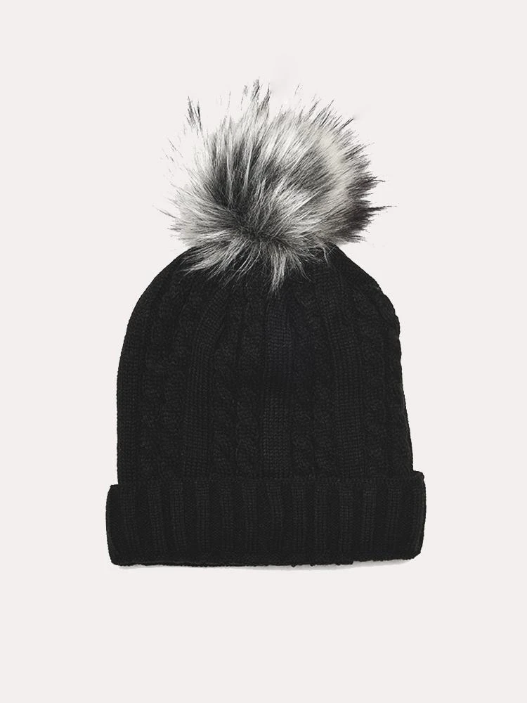FEATURES:Cable knit Cuffed Faux fur pom topper 100% acrylic Machine wash One size