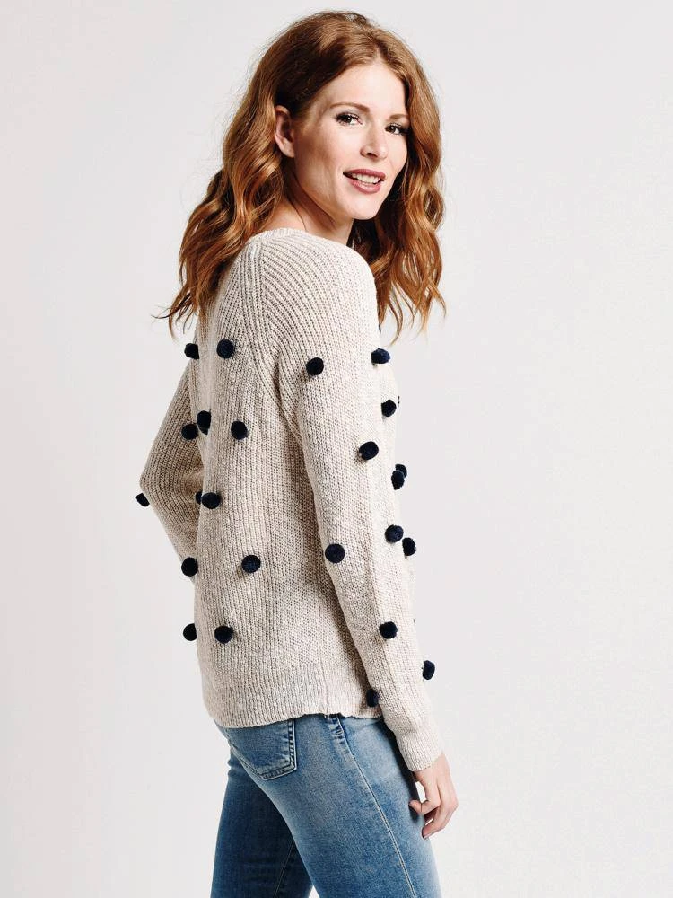 FEATURES:Boatneck Pompom details Raw hem 70% cotton, 30% acrylic Imported Styled with Citizens of Humanity jeans Style # 1416D-989 and Seychelles shoes Style # SURVIVAL. Model is wearing size small sweater and size 26 jean.