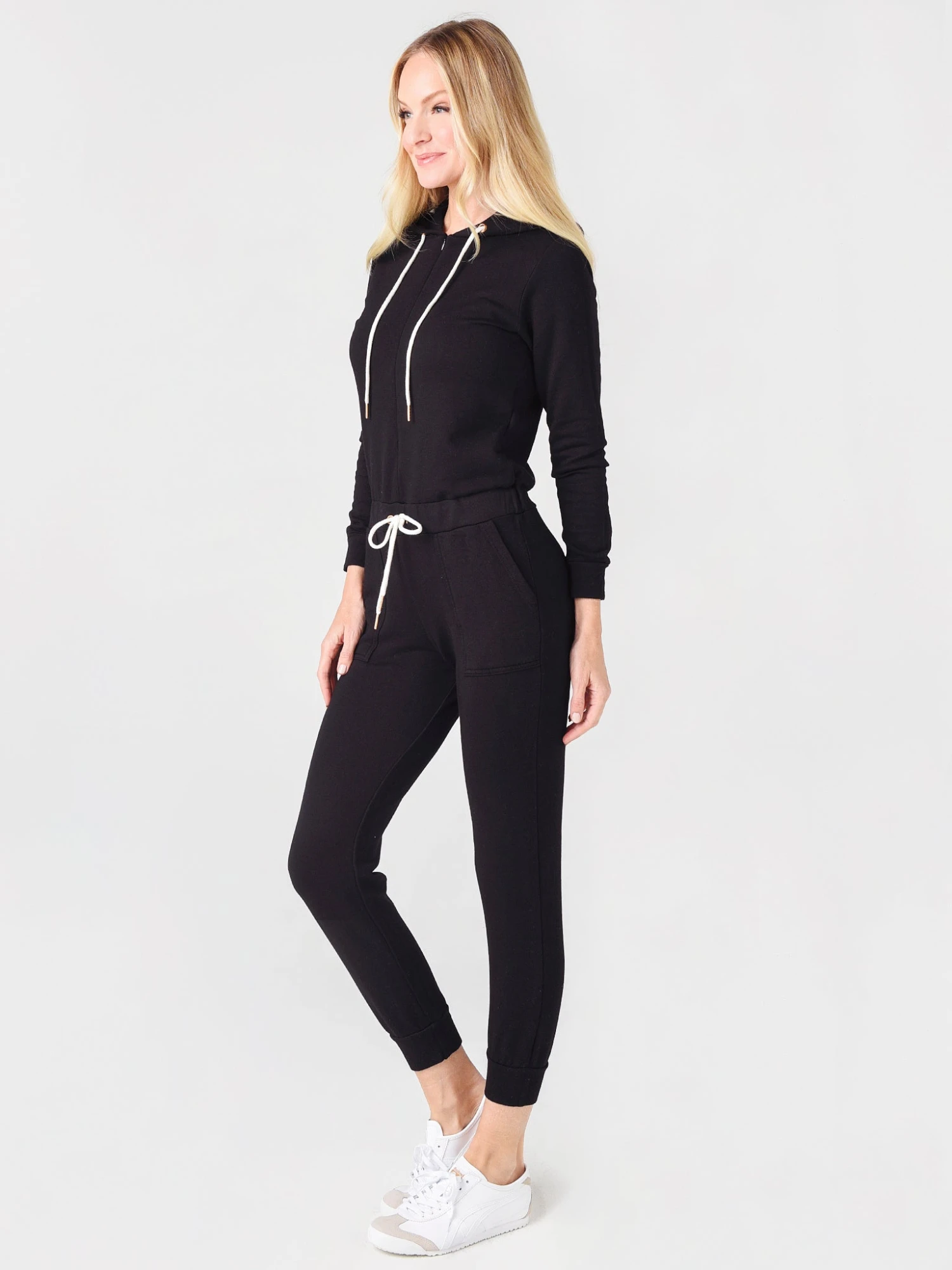 FEATURES:JumpsuitHigh NecklineHooded with DrawstringTop Half, Invisible Zip ClosureElasticized Waistband with Drawstring DetailRibbed Cuffs and Ankle HemsPatch PocketsSuper Soft30% Cotton, 67% Rayon, 3% SpandexModel is wearing size Small jumpsuit.Model’s Measurements: Height: 5’10”; Bust: 34C; Waist: 25.5″; Hips: 36″; Dress Size: 2-4 (US)