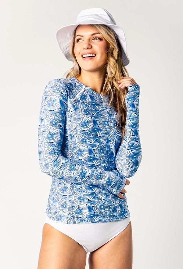 The Mott 50 Margo Long Sleeve Colorblock Swim Shirt With Side Zipper features an elegant design for the pool or beach.