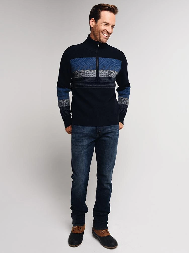 FEATURES:FABRIC:Â 82% Merino Wool, 12% Nylon Knit Blend1/2 Zip: The 1/2 zip offers the extra ease of putting on an overhead garment as well as added option to unzip the garment for additional cooling and comfort.Rib knit hem and cuffsDouble jacquard knitPlain knit with jacquard patternYKK Metaluxe zipperTextured seed stitchAran stitchesRaglan sleeve