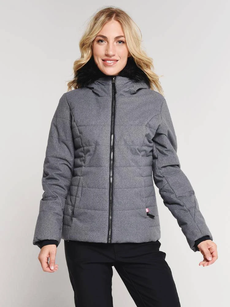 FEATURES:Adjustable hood with removable faux fur hood Padded shoulders Metaluxe front zipper Extra soft fleece-line collar, Interior windguard and chin protectorShaped quiliting on side panels Stretch inner cuffs Elastic cuffs and hem Adjustable and water-resistant powder skirt Interior pocket Insulation: Thermore Ecodown High Loft Insulation 200gm Body, 150gm Sleeve, 115gm HoodOuter Fabric: White: HydroBlock DWR 100% Nylon Coated Ripstop with Ivory Rabbit faux fur; Nightfall: HydroBlock Sport 52% Polyester 48% Nylon Brushed Twill with Black Finn Raccoon faux fur; Midnight Garden: HydroBlock Pro 100% Polyester Plain Weave 2-Way Stretch with Black Finn Raccoon faux furStyled with Obermeyer pants Style # 15028. Model is wearing size 8 jacket and pant.