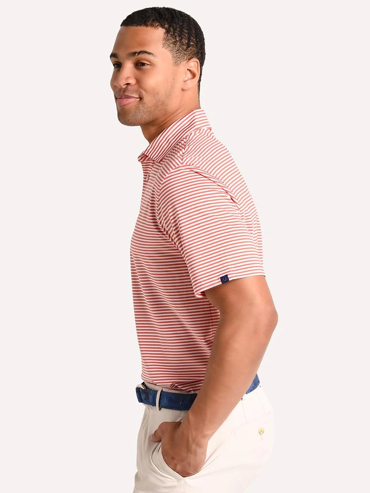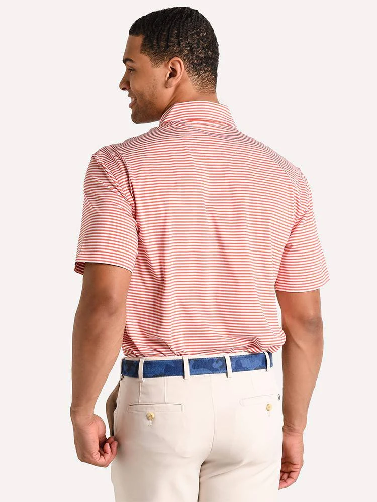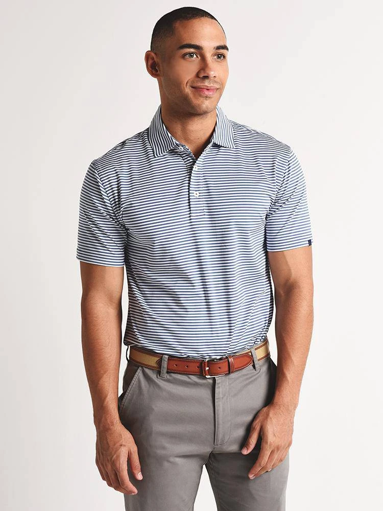 FEATURES:Short sleeve stripe jersey poloSelf collarCOOLMAX  moisture wicking Antimicrobial92 % Polyester COOLMAX , 8% SpandexMachine wash cold with like colors, gentle cycle, tumble dry low, remove promptly, warm iron if needed, do not add softenerImported Styled with Peter Millar Style # ME0EB82. Model is wearing size Medium shirt and 32 short.