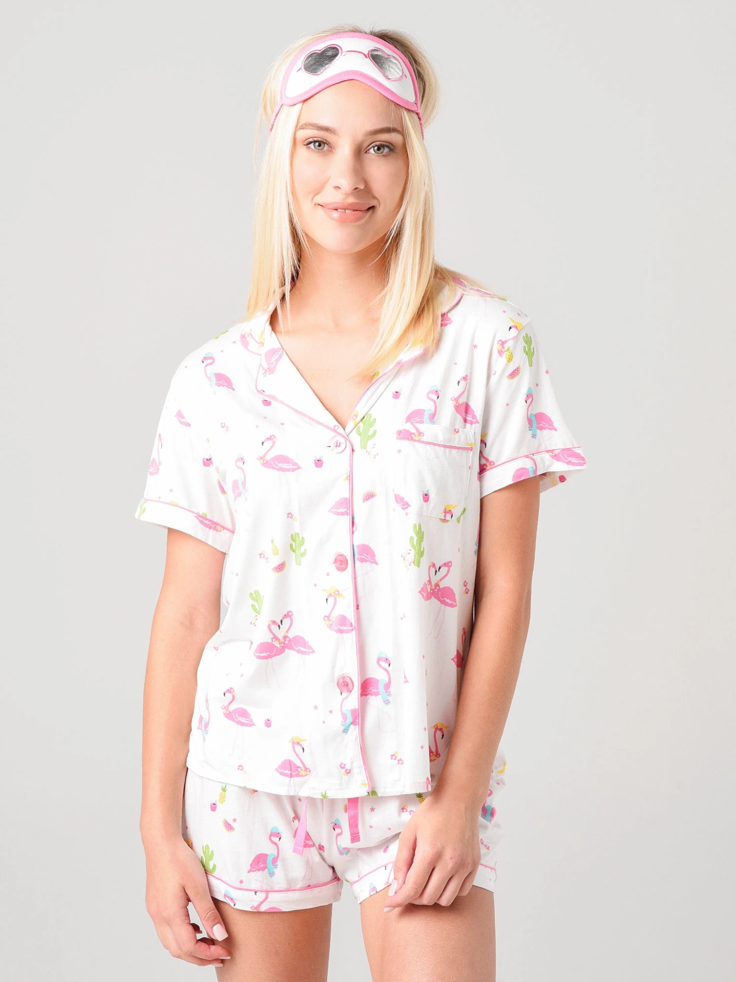 FEATURES:Pajama SetButton-Down TopLapel DetailPiping DetailLeft Chest PocketAll-Over Playful PrintClassic PJ ShortElasticized Waistband with Drawstring DetailSuper SoftSleep Mask Included55% Cotton, 45% ModalModel is wearing size Small pajama set.Model’s Measurements: Height: 5’9″; Bust: 32B; Waist: 25.5″; Hips: 36.5″; Dress Size: 4 (US)