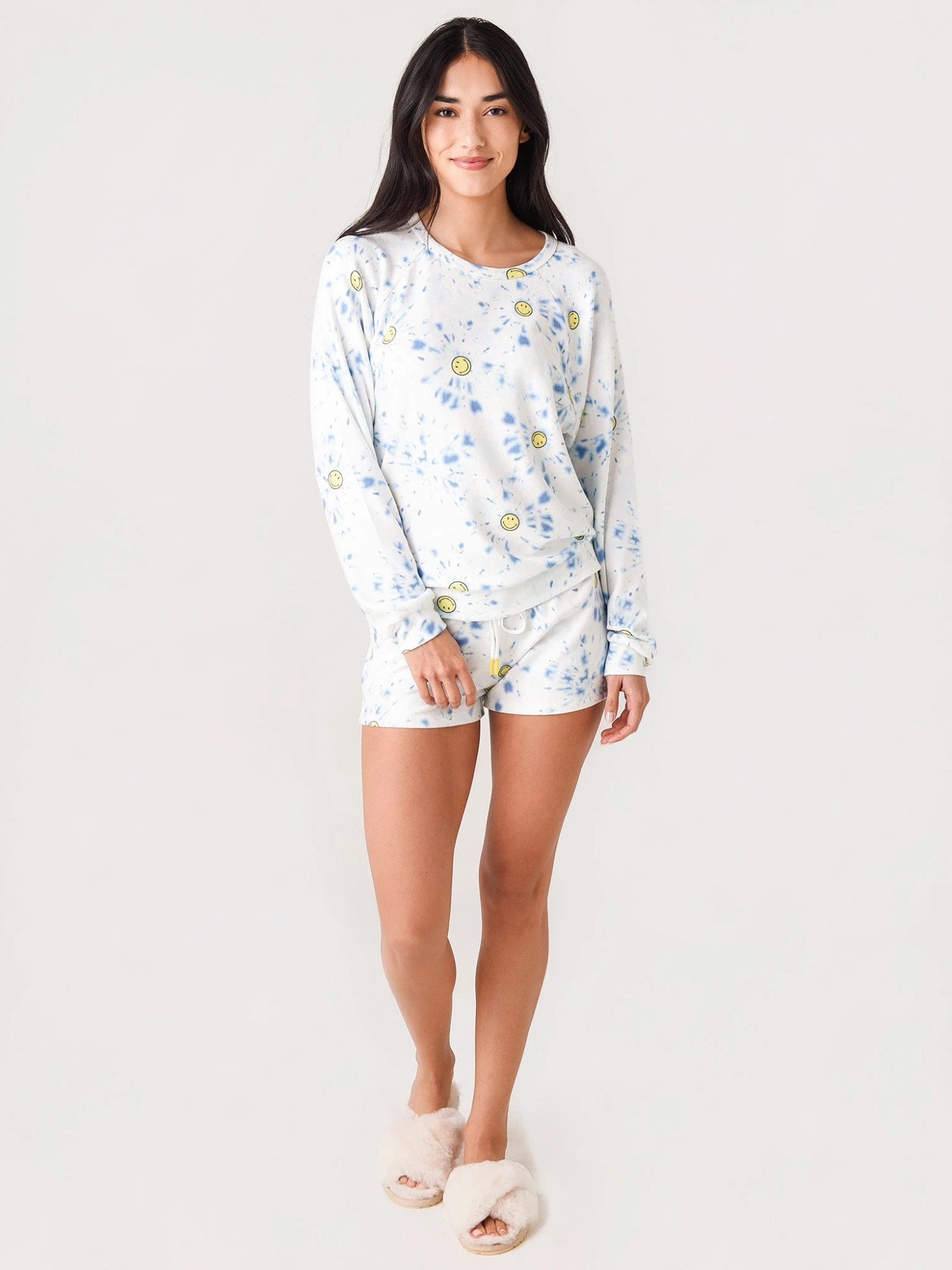 FEATURES:Pajama ShortElasticized Waistband with Drawstring DetailAll-Over Tie-Dye with SmileySuper Soft and CozyPeachy Jersey Fabrication81% Polyester, 14% Rayon, 5% ElastaneModel is wearing size Small short.Model’s Measurements: Height: 5’8″; Bust: 32B; Waist: 25″; Hips: 36″; Dress Size: 2 (US)