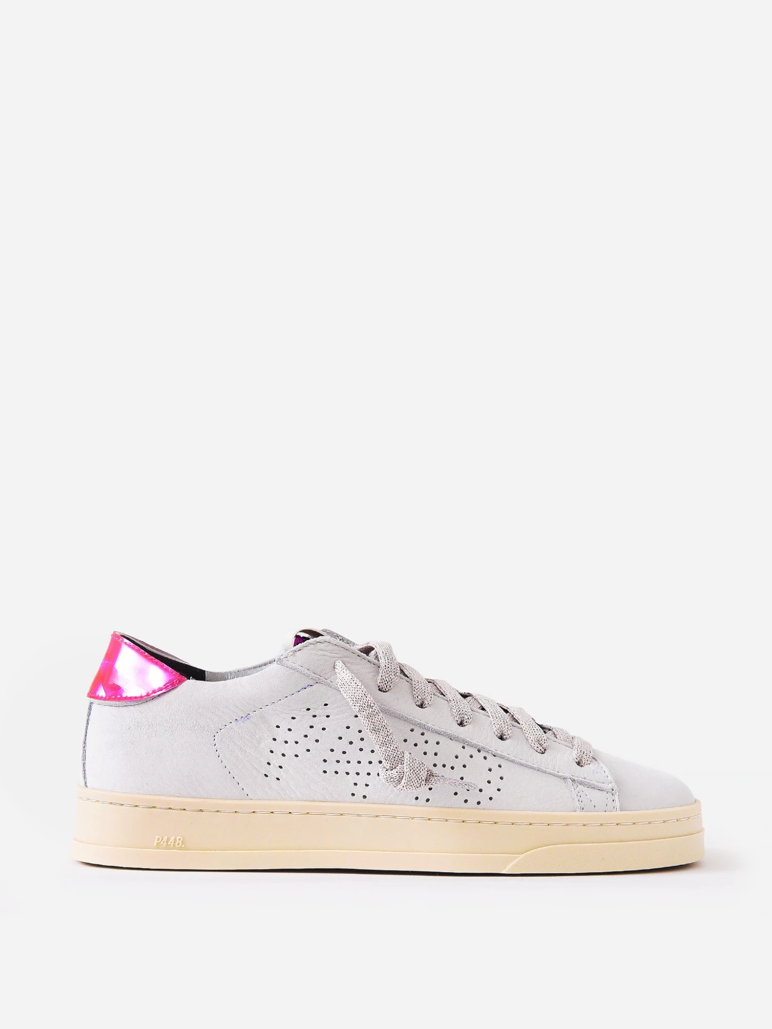FEATURES:SneakerLace-Up Vamp, Ivory & Silver Lurex LaceFlocked Rainbow Leopard-Printed Leather TongueWhite Nubuck Upper, Trim & Toe With Perforated LogoReflective PVC Heel TabTerry Cloth Lining With Silver Leather AccentRubber Sole