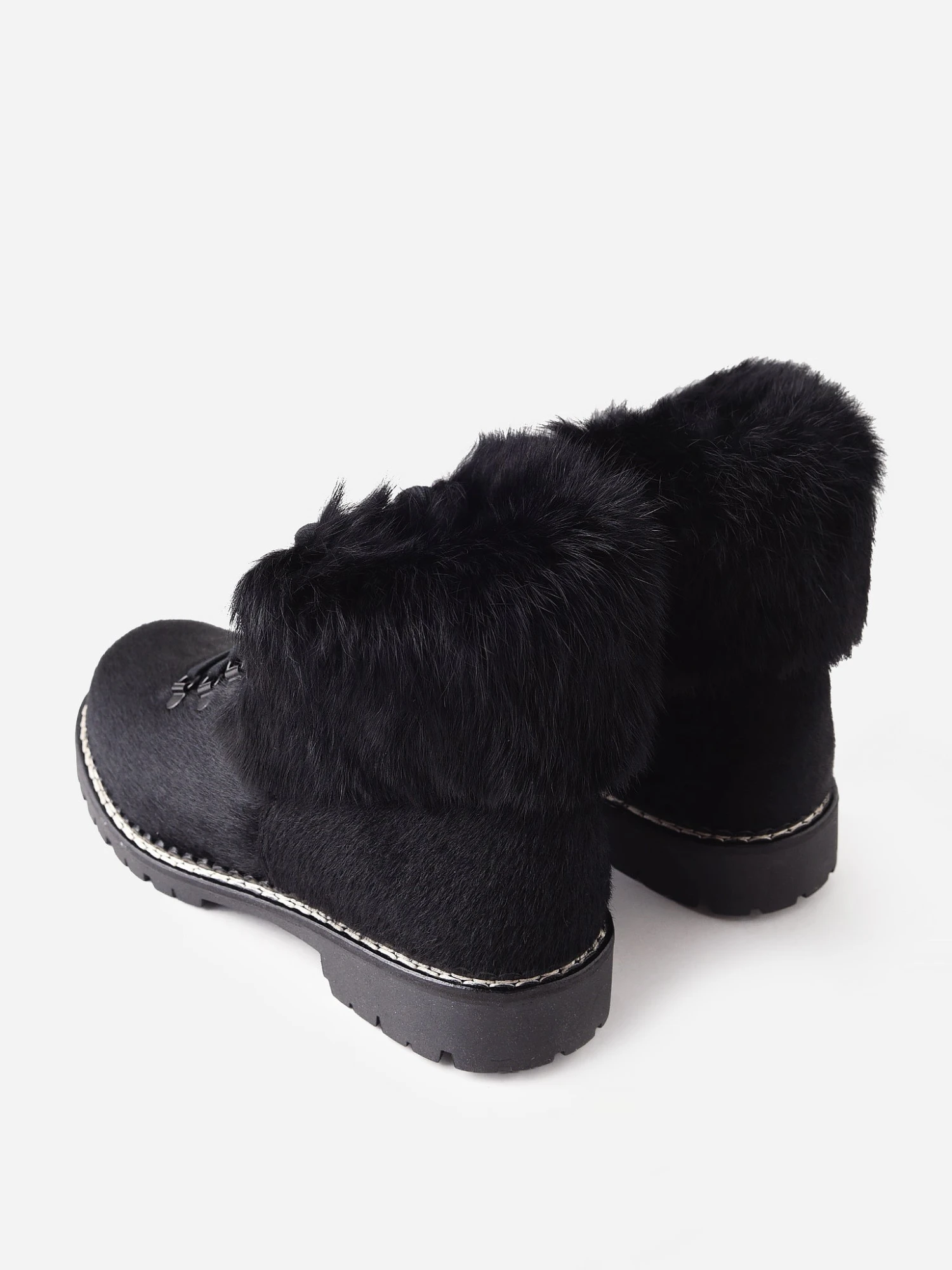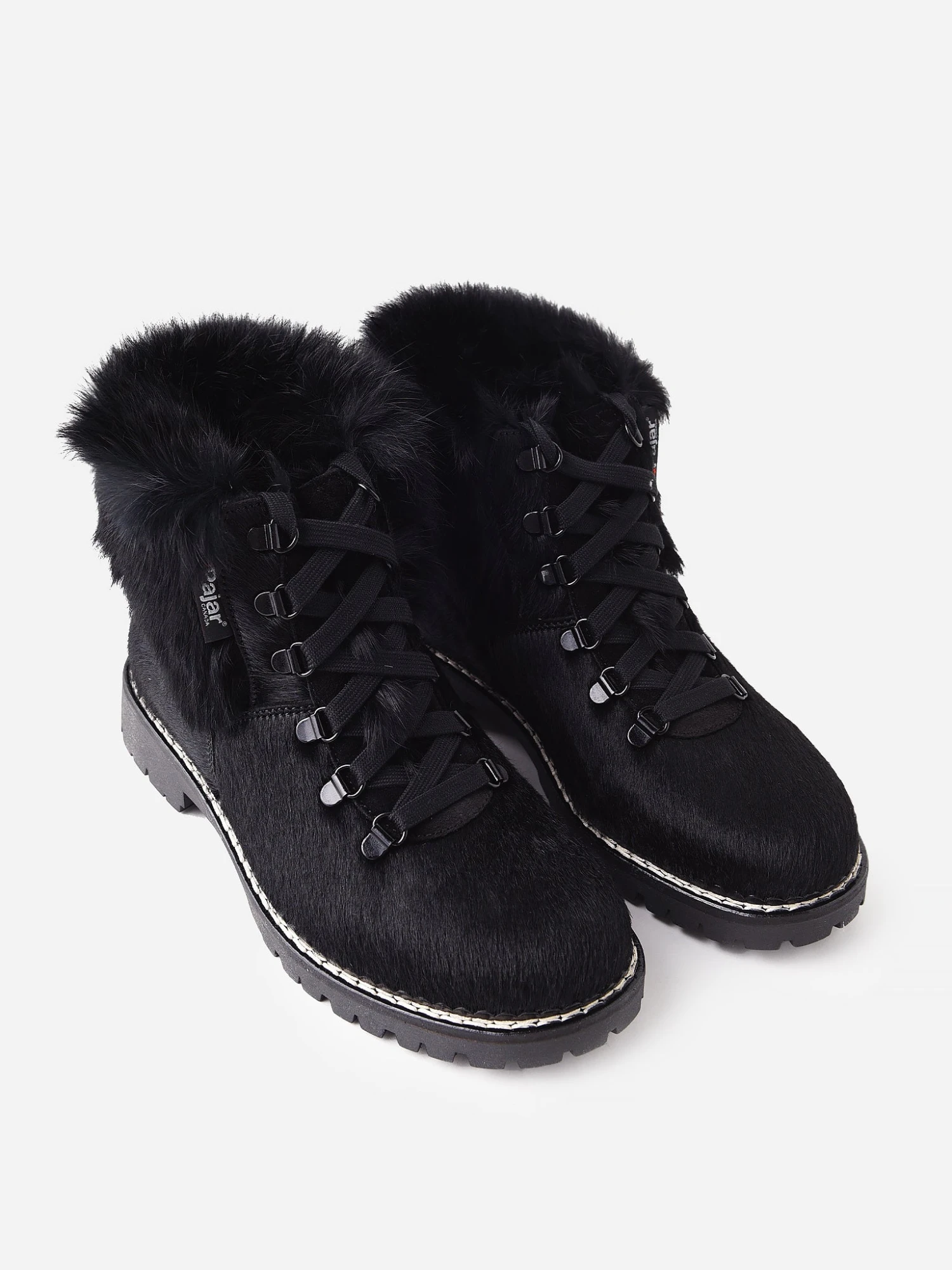 FEATURES:Après-Ski Bootie, Winter BootieRounded ToeLace-Up VampRabbit Fur Trim CollarUppers: Waterproof Premium SuedeLining: WoolInsole: Felt Blend and Aluminum Insolation (Breathable and Anti-Microbial)Comfort Rated at -20°C (-4°F)Outsole: Excellent Grip Lug RubberWaterproof, Pre-Treated to Repel Water and StainsComfort Rated at -20°C (-4°F)