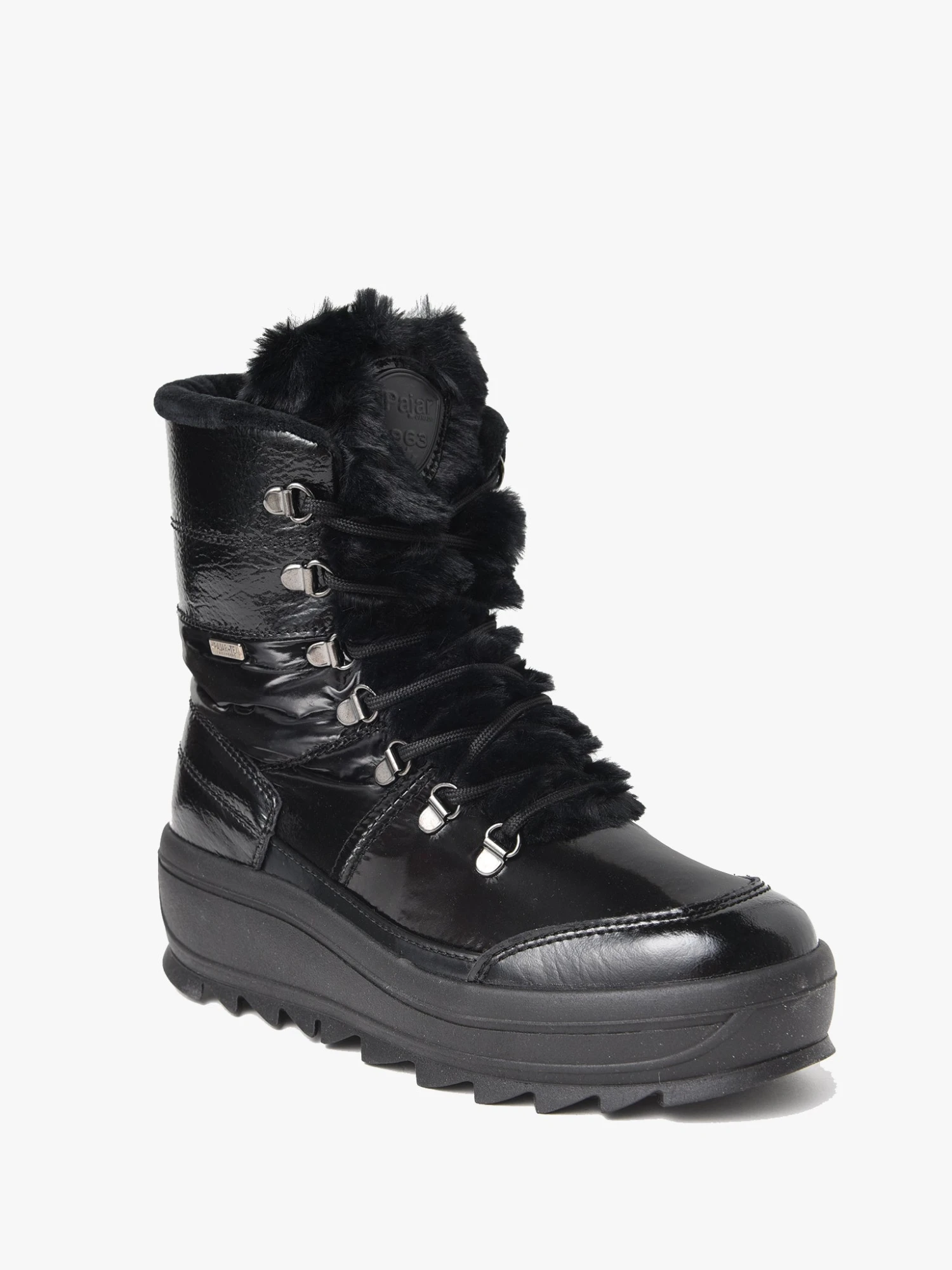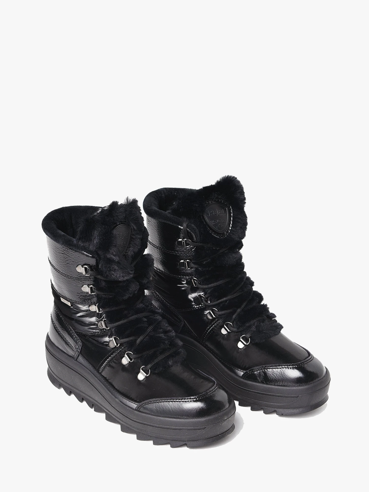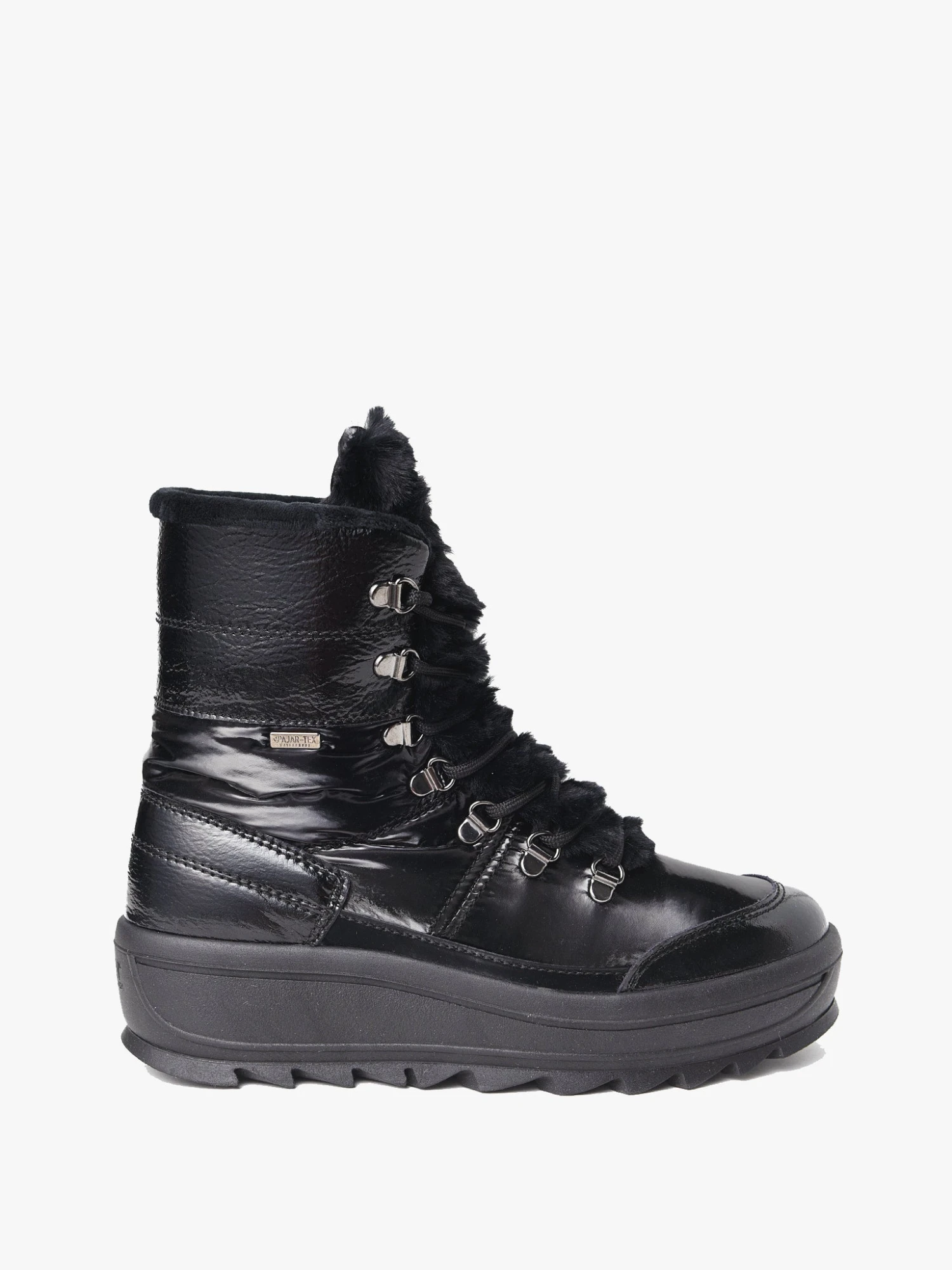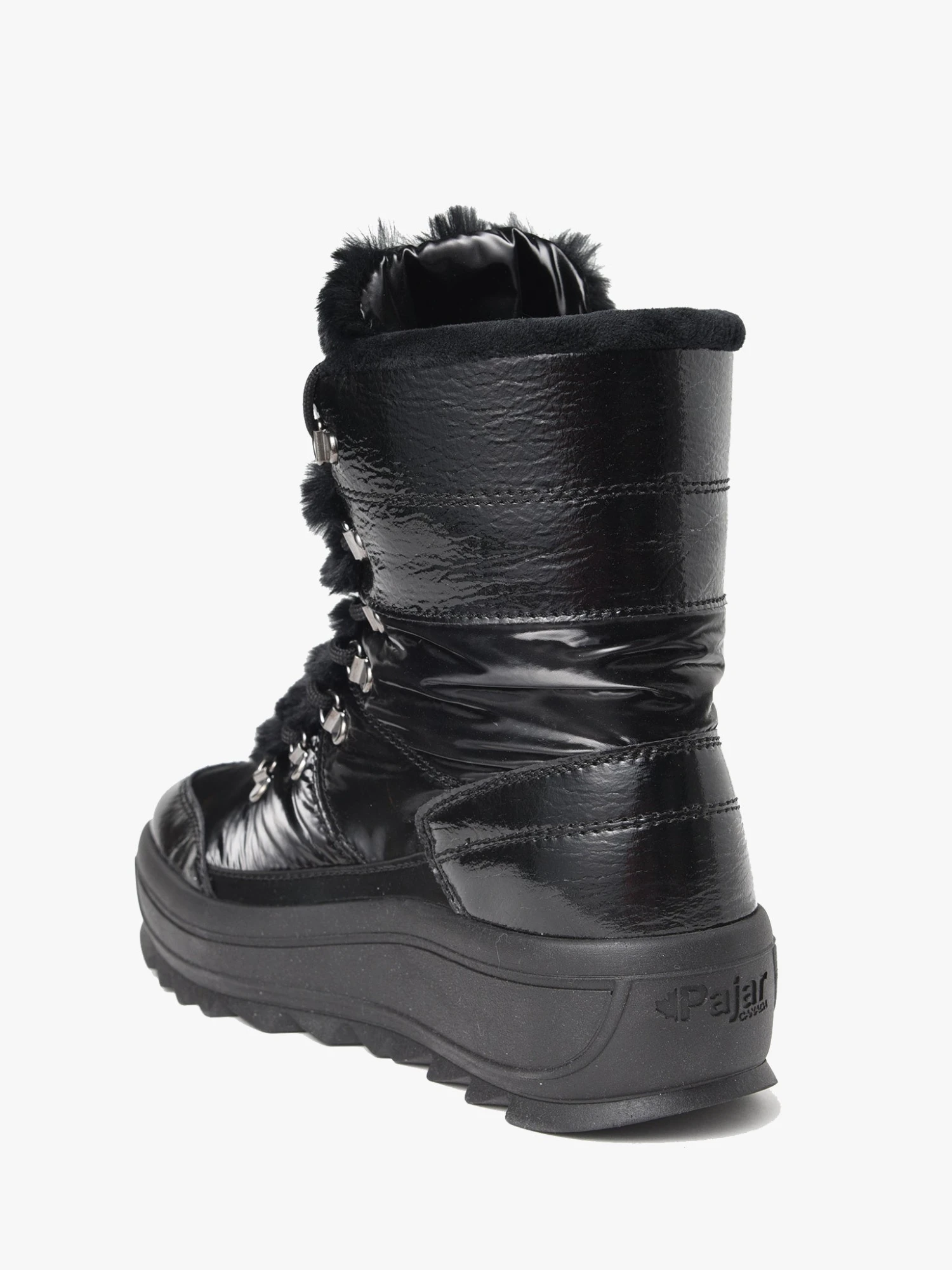 FEATURES:Après-Ski Bootie, Winter BootieRounded ToeLace-Up VampFaux Fur TongueFleece Lined InteriorGlossy Waterproof Leather and Synthetic UppersPajar Rubber Lug SoleSuper Warm