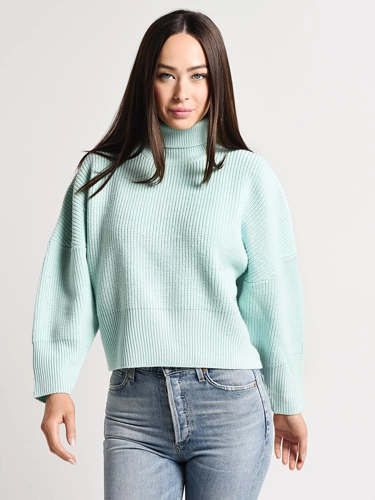 FEATURES:Turtleneck Dropped shoulder seams with batwing-style sleeves Fitted ribbed trimOversized fit 100% merino wool Hand wash