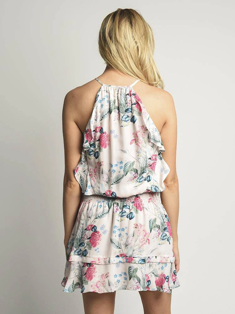 FEATURES:High neckline with keyhole Ruffle trim Smocked waistband Tiered ruffle hemline Lined 100% silk Dry clean Model is wearing size small dress.
