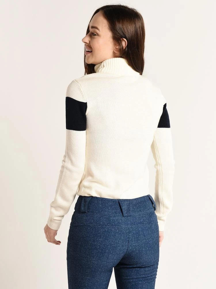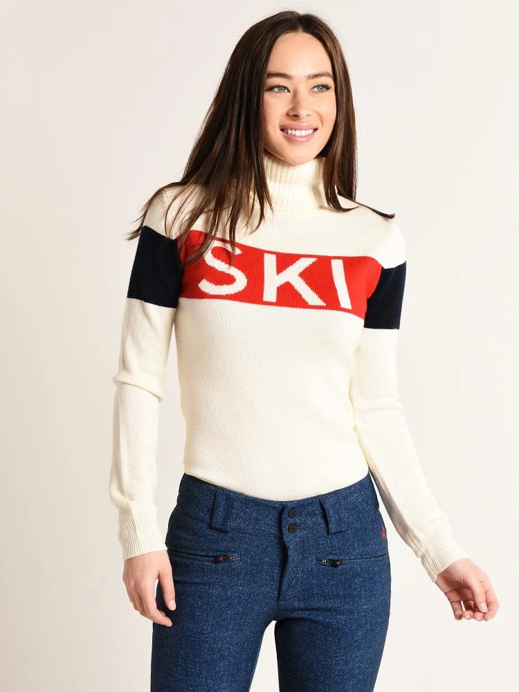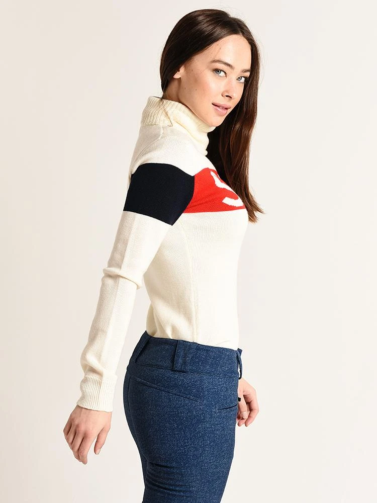 FEATURES:Embroidered star logo at cuffContrast striping at sleevesPullover styleWaist-length styleTurtleneckShell: 100% woolHand wash or dry cleanImported, ChinaStyled with Perfect Moment Pant Style # AURORA FLARE PANTS. Model is wearing size small top and Small pant.