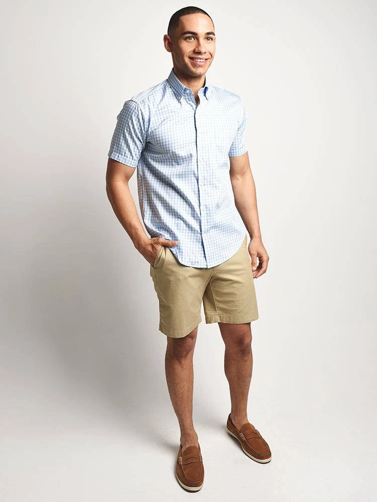 FEATURES:French placketButton-down collarShort sleevesChest patch pocketBack yoke with box pleatCurved hem74% cotton, 26% silkDry cleanImportedStyled with Peter Millar shorts Style # MC0EB82. Model is wearing size medium polo and size 32 short.