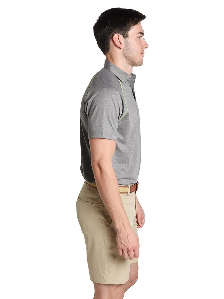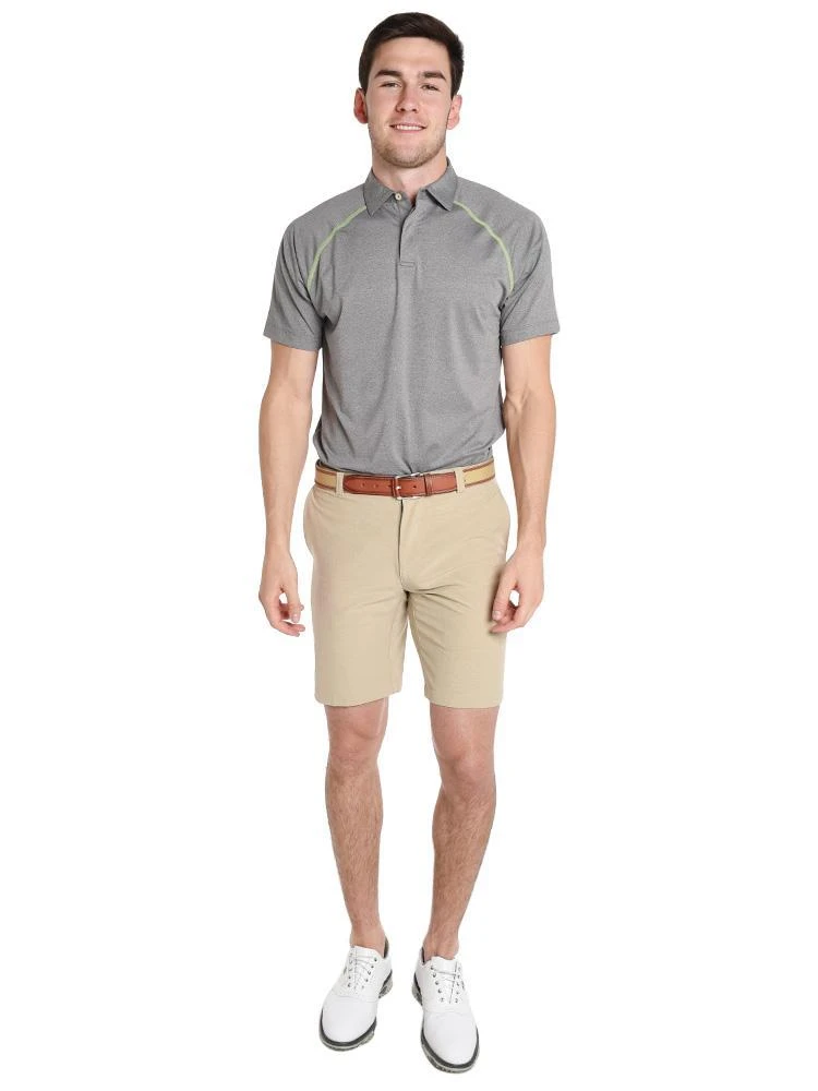 FEATURES:Two button placket with collar Contrasting seams UPF 50+ sun protectionFinished with reflective heat seal for visibilityLightweightFour-way stretch fabricMoisture-wicking and quick-drying with odor control Athletic fit 92% polyester, 8% spandexMachine wash Styled with Peter Millar shorts Style # MS18EP01. Model is wearing size medium polo and size 32 short.