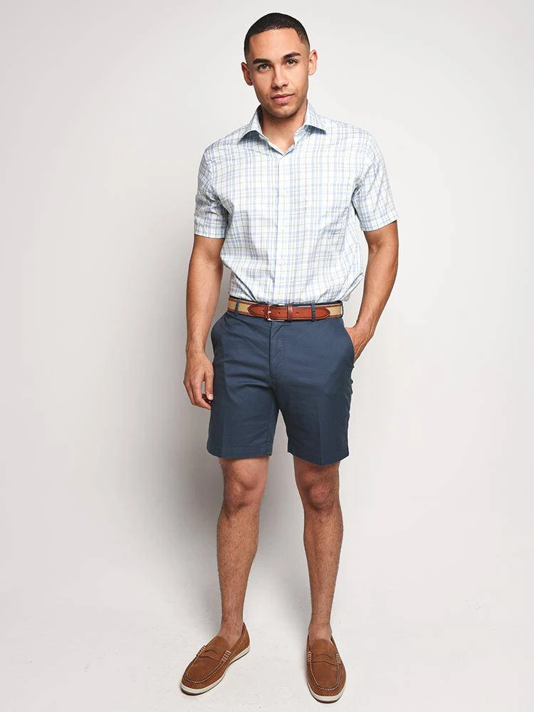 FEATURES:Spread collar Chest pocket French placket Box-pleat center back yoke100% cotton Machine wash Imported Styled with Peter Millar shorts Style # MC0B13 and shoe Style # MS18F02. Model is wearing size medium shirt and size 32 short.