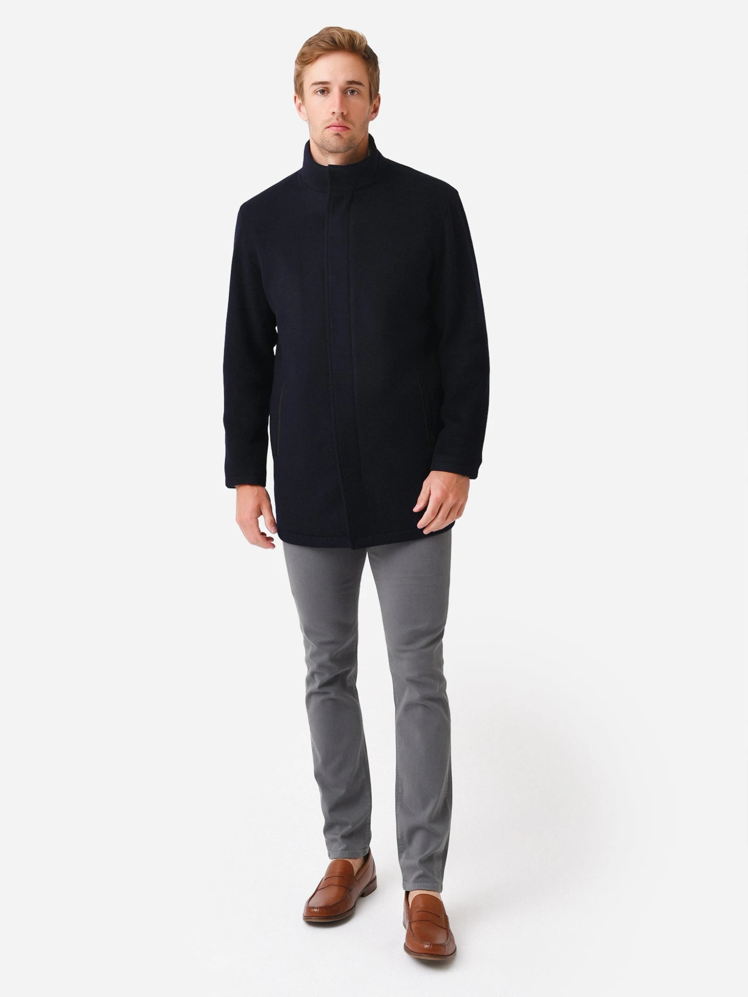 FEATURES:CoatStand-Up CollarFront Zip ClosureLong SleeveSide PocketsZip Closure with Snap ButtonsKnit Fabrication2-Way StretchStraight Hem100% WoolClassic FitModel is wearing size Medium coat.Model’s Measurements: Height: 6’2″ | Waist: 32″ | Inseam: 33″ | Collar: 15″ | Sleeve: 35″ | Suit: 42L