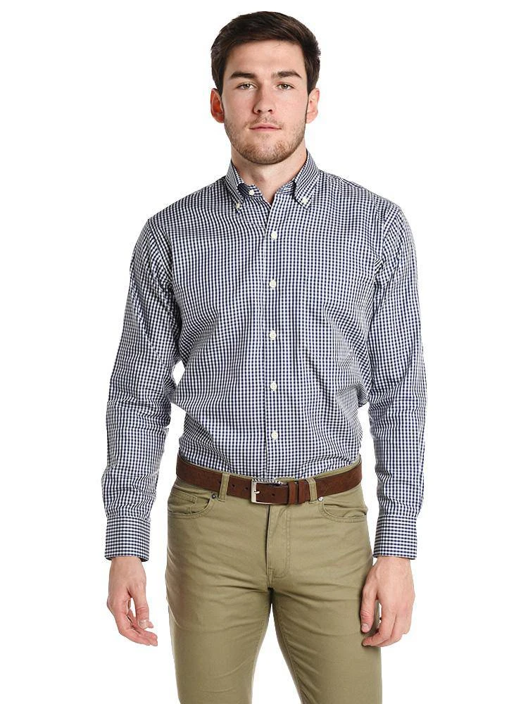 FEATURES:Button down collarChest pocket French placket Double-barrel cuffs Box pleat at back Elongated Shirttail 74% cotton, 26% silk Machine wash or dry clean Imported Styled with Peter Millar pants Style # MS18B47 and loafers Style # MC0F11. Model is wearing size medium shirt and size 32 pant.