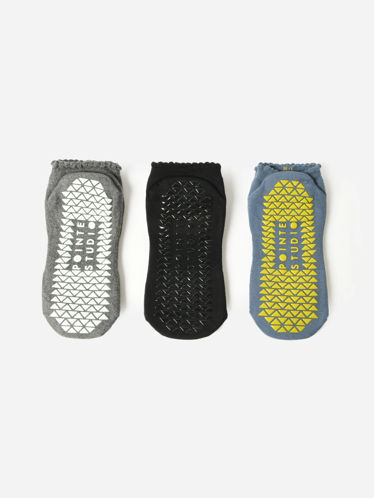 Three-pack of ankle-length grip socks with an embroidered smile design.