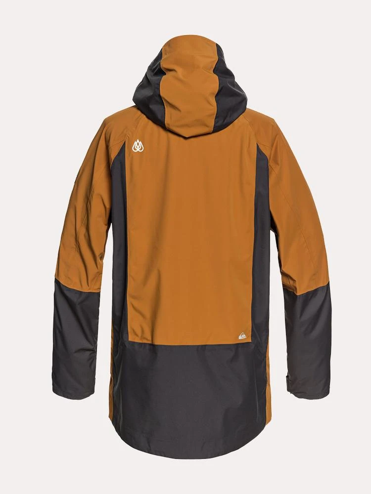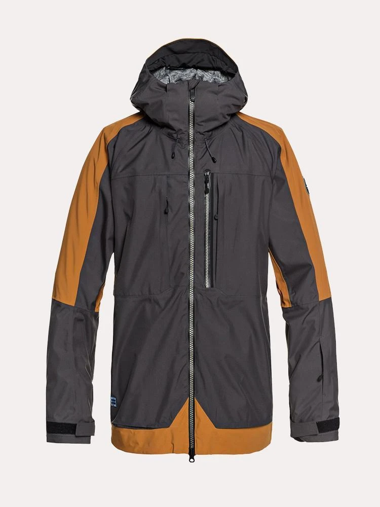 FEATURES:Adjustable, helmet compatible hood Fully taped seamsFixed stretch powder skirt with tuck away system and snap fastenersJacket-to-pant attachment systemYKK Aquaguard zipsHand-warmer pockets with key clipLens cleaner inside hand-warmer pocketPass pocket, Inside media pocket, Inside mesh goggle pocketMesh lined underarm vents and on chest Internal stretch wrist gaiters with thumbholes and adjustable cuffs Seamless mega-stretch cell lining0K Quiksilver DryFlight technology for extreme waterproofing [20,000 mm/20,000 g]REPREVE recycled polyester blend plain weave85% Polyester, 15% Elastane