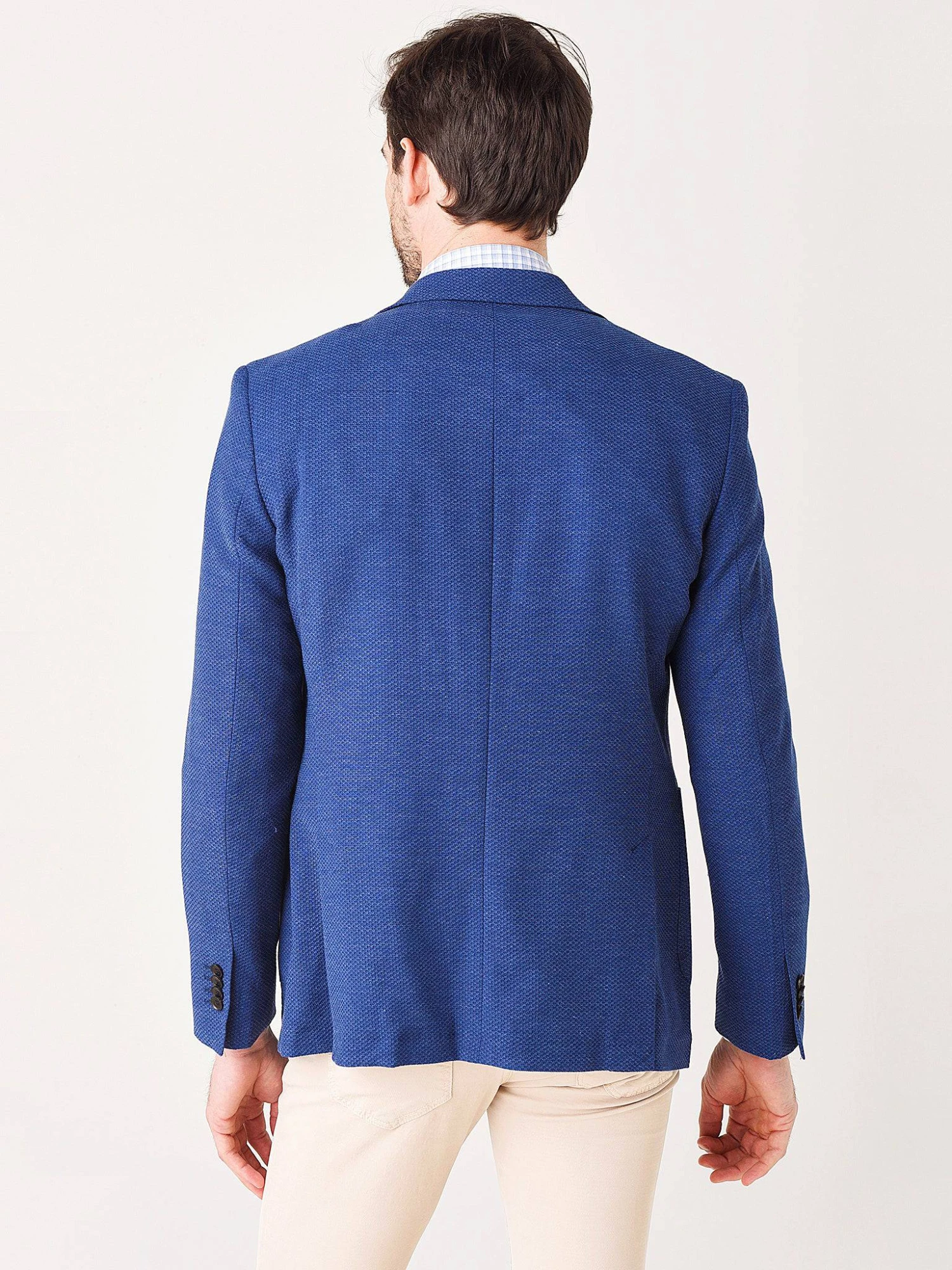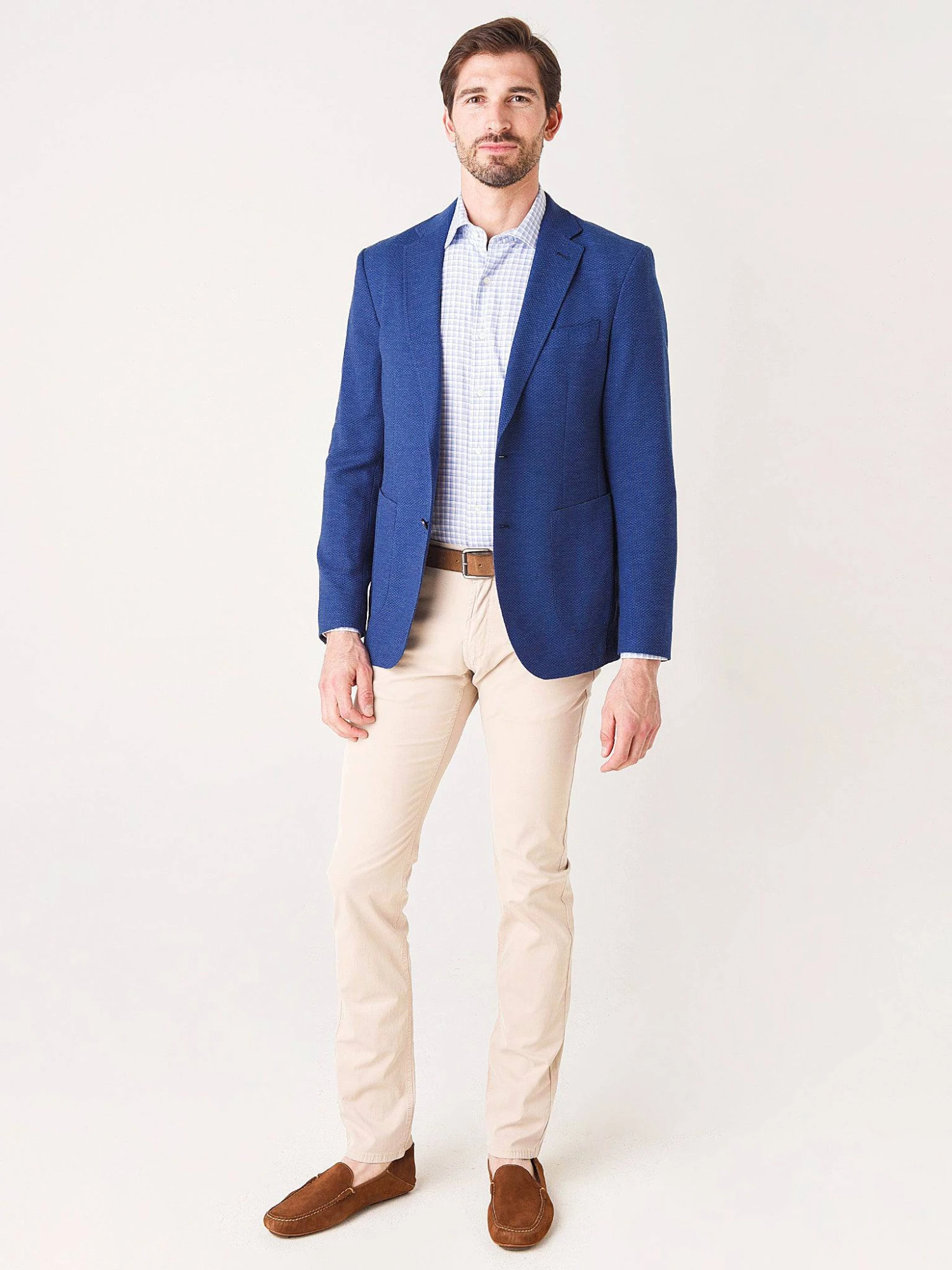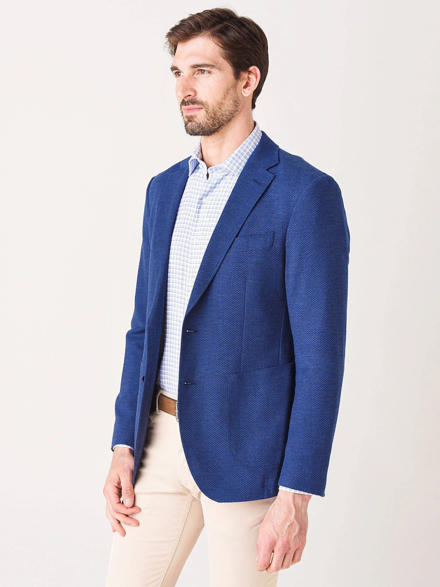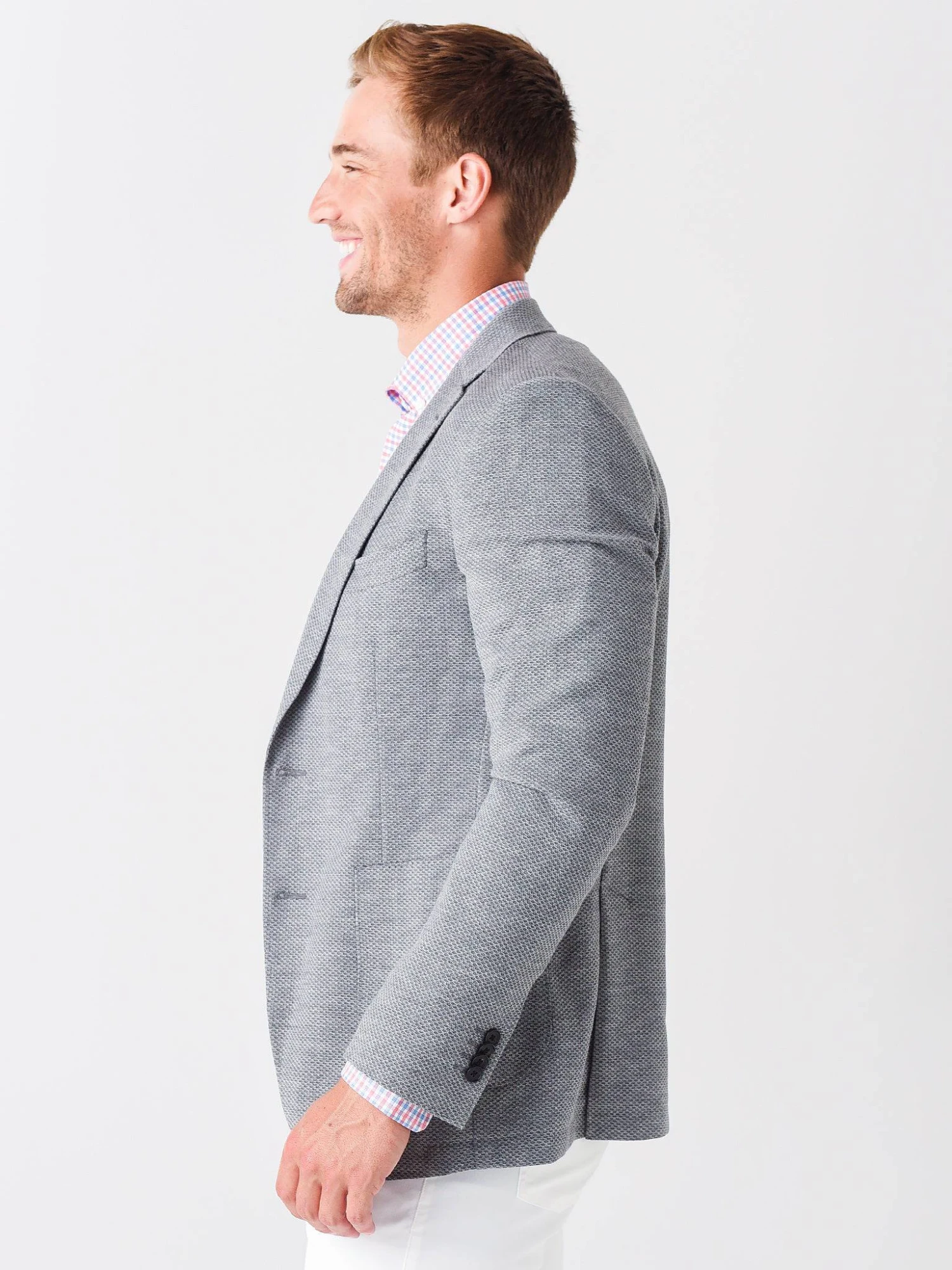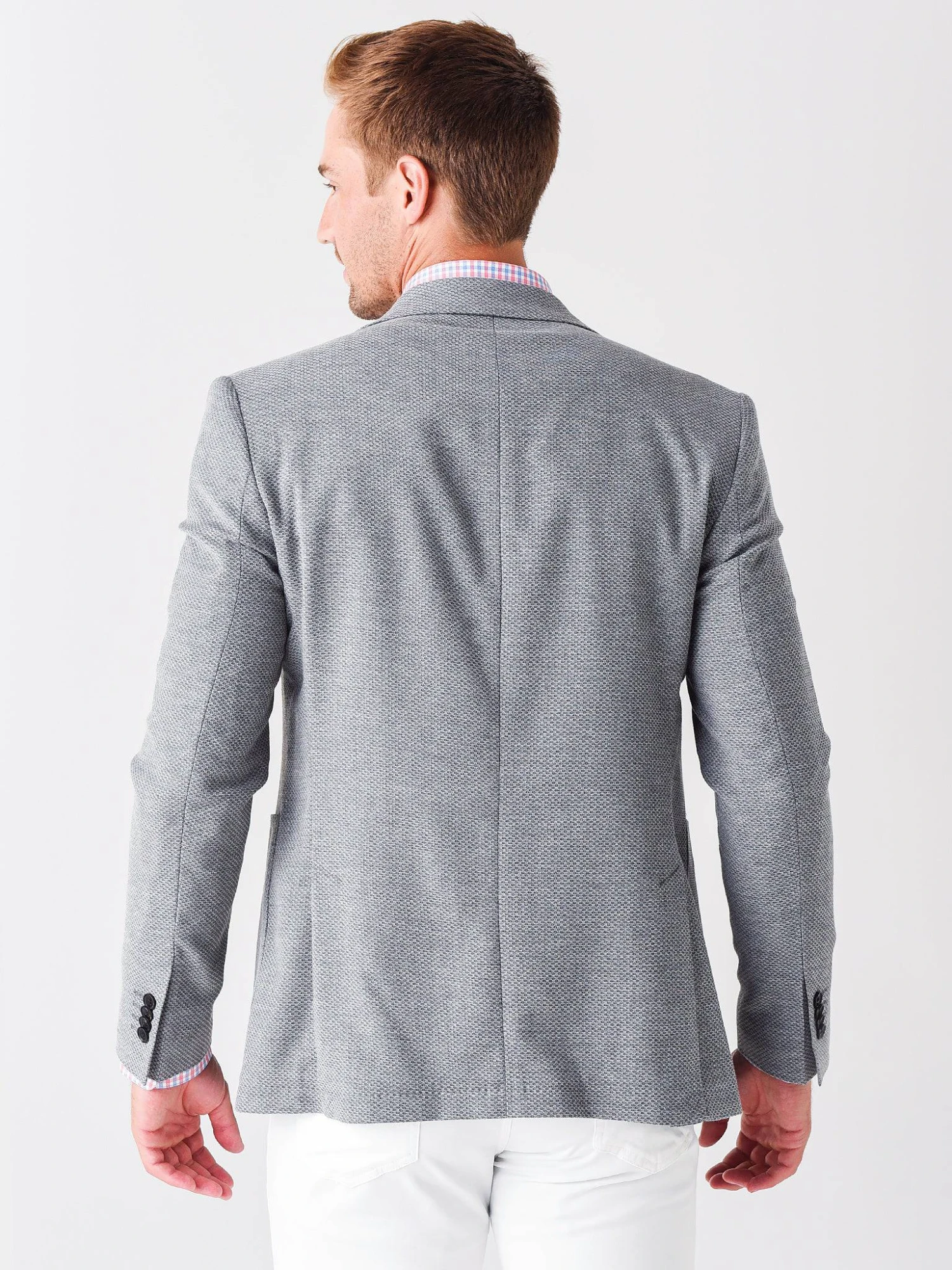 FEATURES:SportcoatNotch LapelsSingle Breasted, 2-Button Closure2 Side Patch PocketsHalf-Lined InteriorSports FitPick Stitching at Lapel, Hem and PocketsDouble Back Vents78% Wool, 19% Cotton, 3% ElastaneModel is wearing size medium jacket, size medium button-down and size 32 pant.Ink: Model’s Measurements: Height: 6’3″; Waist: 32″; Inseam: 33″; Collar: 15.5″; Sleeve: 35″Grey: Model’s Measurements: Height: 6’2″; Waist: 32″; Inseam:33″; Collar: 15″; Sleeve: 35″