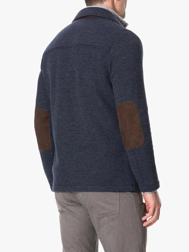 The classic peacoat has been reworked with a stretch knit fabric. Milled in Italian from a wool-rich blend, the jacket features a classic collar with a genuine suede collar stand, and genuine suede elbow patches.