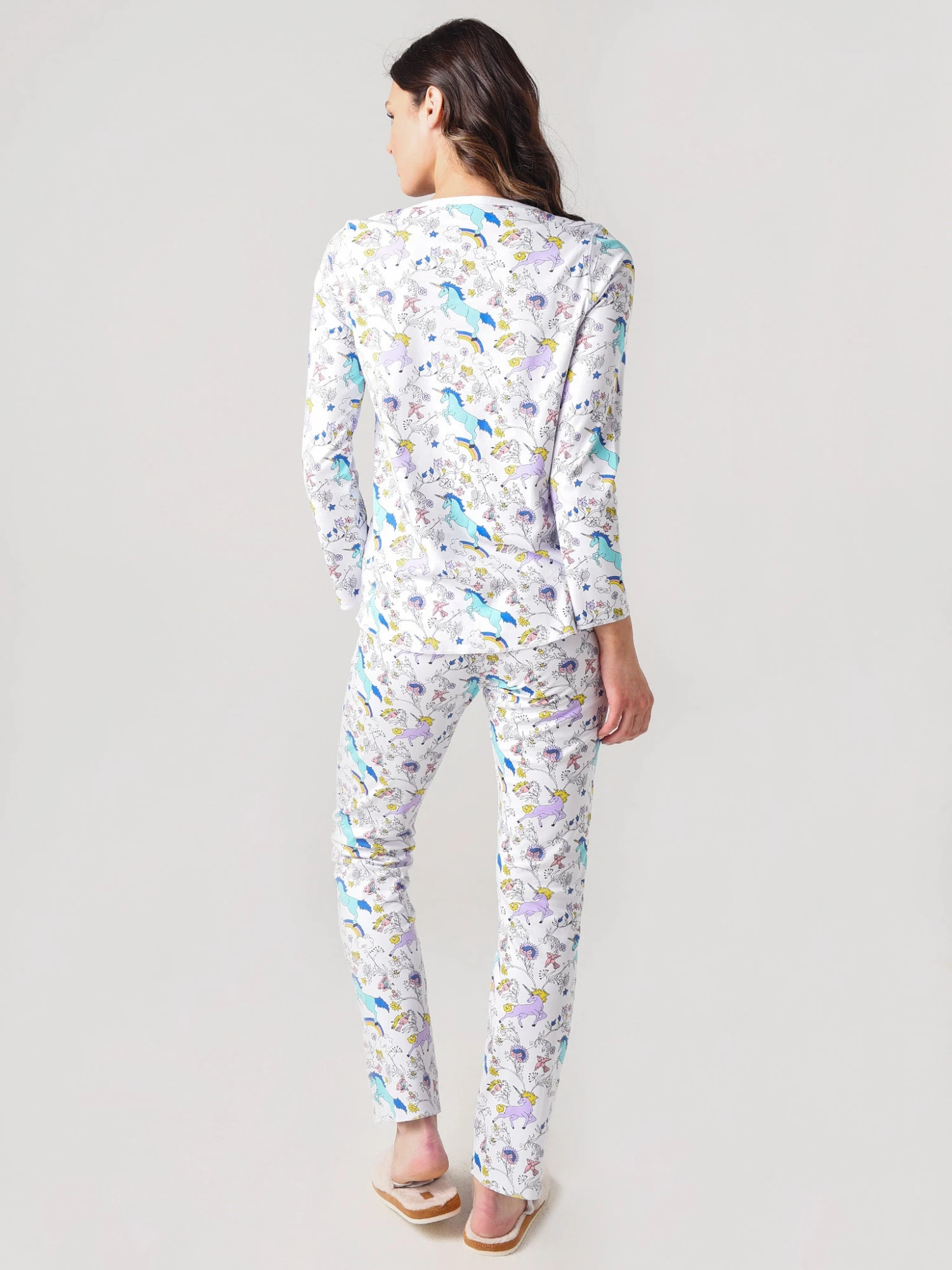 FEATURES:Pajama SetRound NecklineLong sleeveButton-Down PlacketAll-Over Dreamy Unicorn PrintElasticized WaistbandStraight LegSuper-Soft100% Pima CottonModel is wearing size Small pajama set.Model’s Measurements: Height: 5’9.5″; Bust: 34A; Waist: 26.5″; Hips: 37″; Dress Size: 2-4 (US)