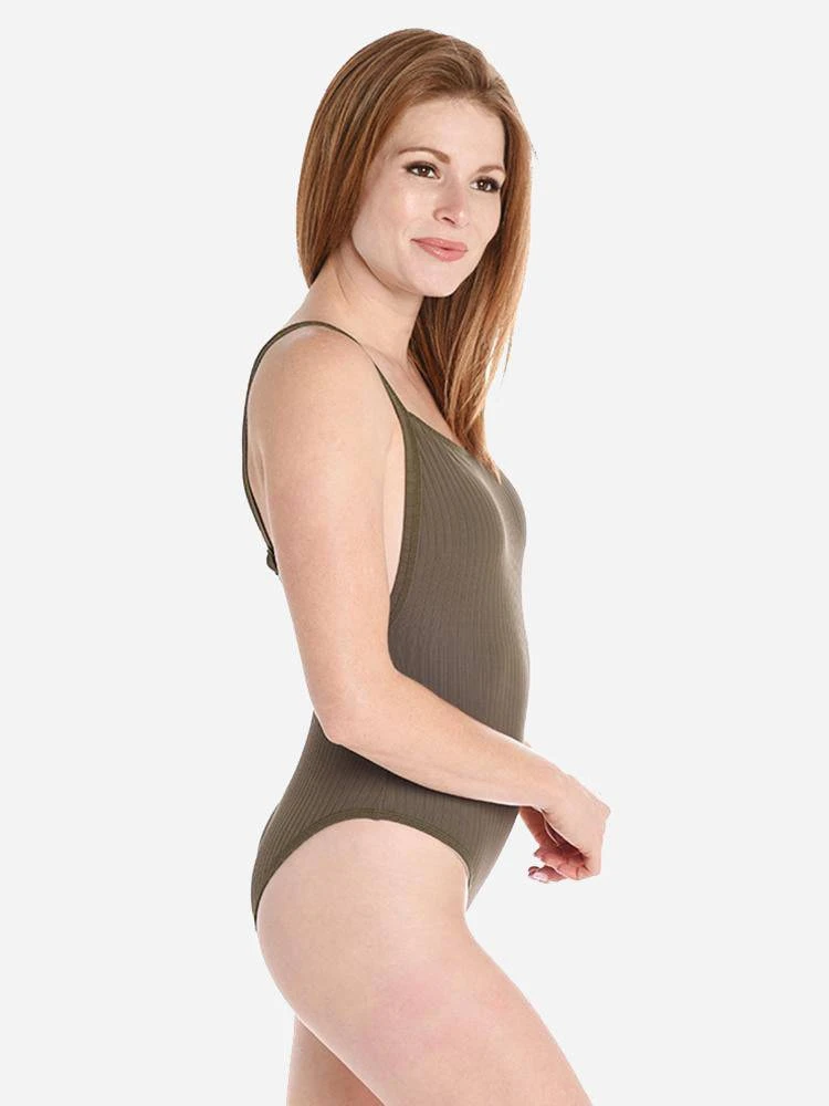 FEATURES:Deep V neckline.Adjustable thin straps.Fastening at mid-back.Low-scoop back.High-cut legs.Moderate seat coverage.Polyester/spandex.Imported.Model is wearing is 10 suit.