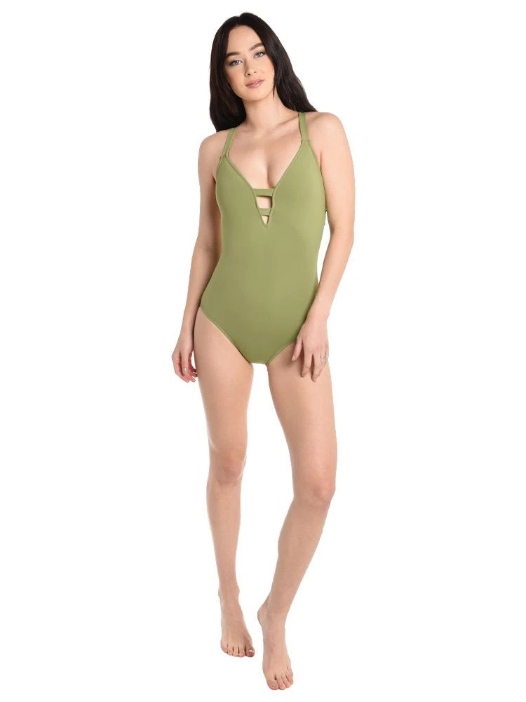 FEATURES:Multi-Linear Strapping Shelf Bra with Removable Cups’V’ Shape NeckMedium rear coverage.87% Nylon 13% ElastaneMachine wash cold, line dry in the shade.Imported.Model is wearing size 8 suit.