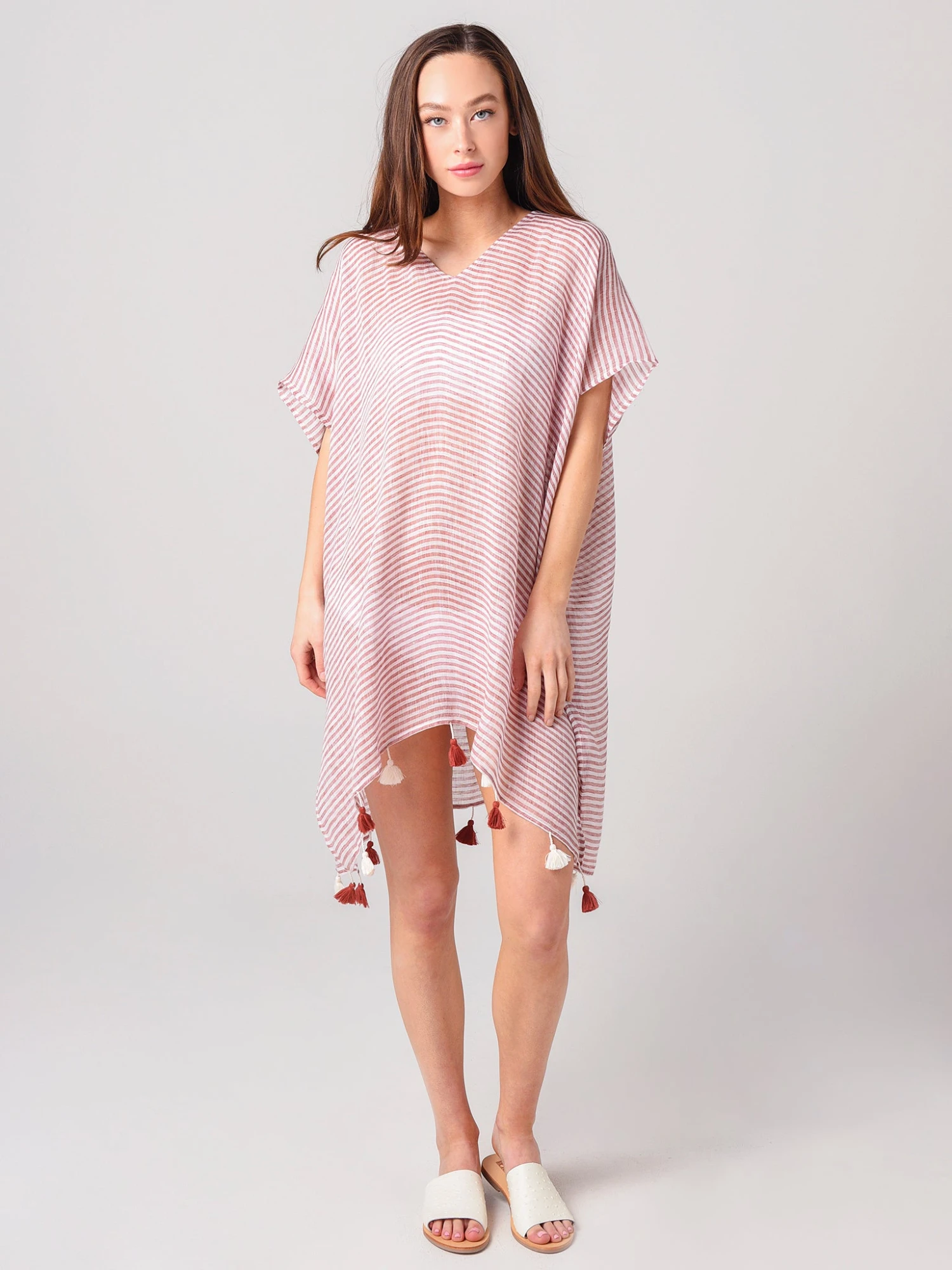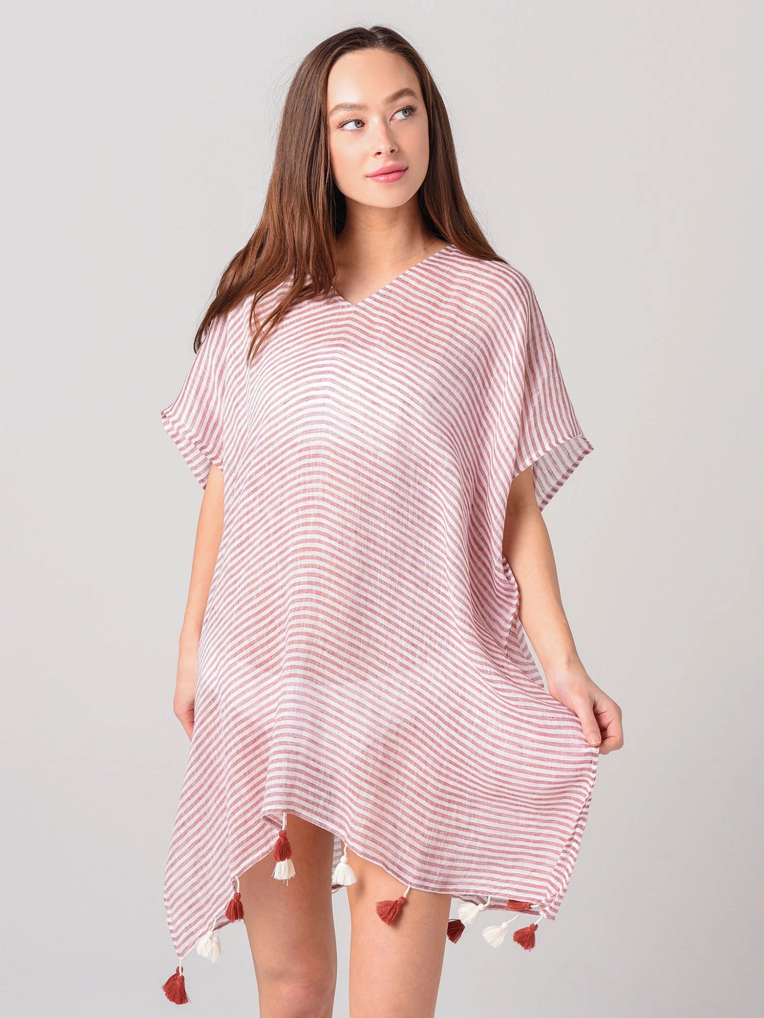 FEATURES:Caftan/Cover-UpV-NecklineStripe PatternHandkerchief HemTassel Trim DetailSubtle SheernessLightweight100% LinenModel is wearing size Small cover-up.Model’s Measurements: Height: 5’10.5″; Bust: 32C; Waist: 25″; Hips: 36″; Dress Size: 4 (US)