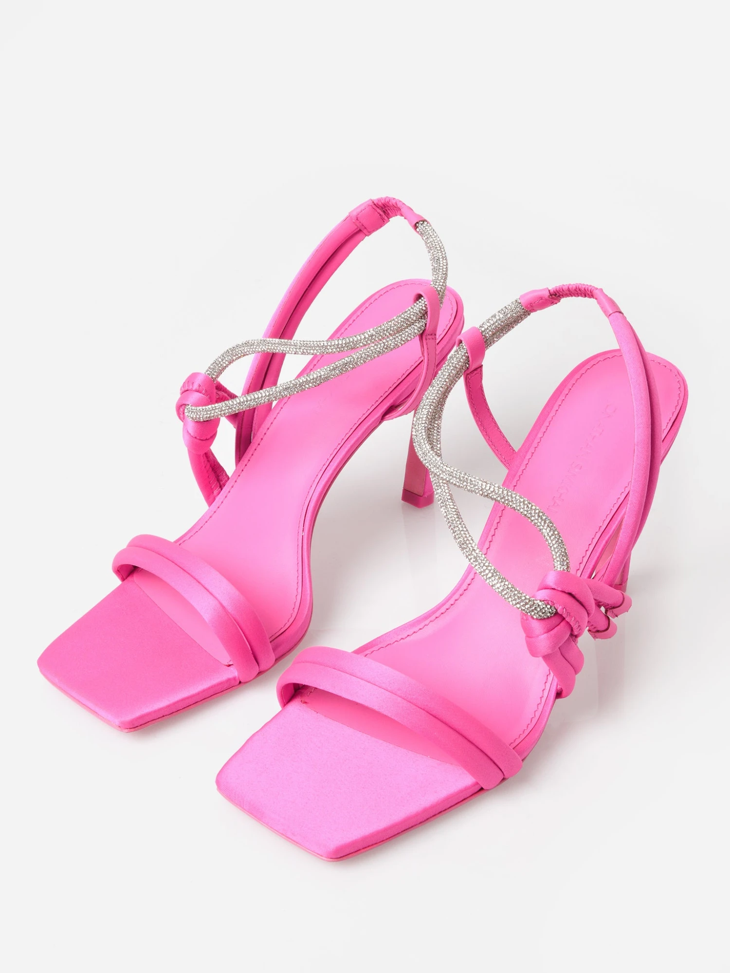 FEATURES:Heeled SandalOpen Square ToeSlip-On StyleSatin & Rhinestone UpperLeather Lining & SoleSatin-Covered HeelHeel Height: 4 in.