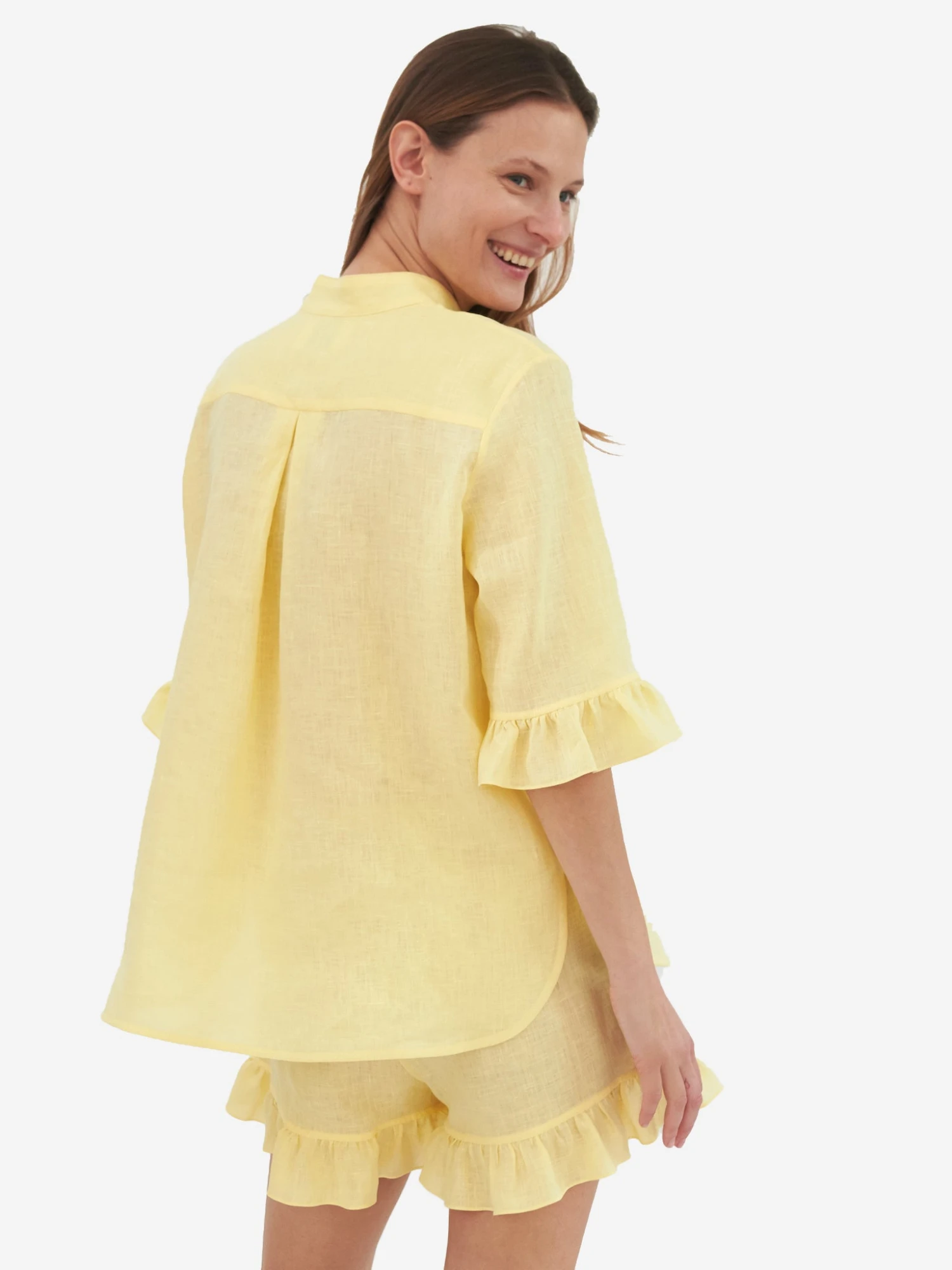 FEATURES:Lounge Suit2-Piece SetMock CollarButton-Down FrontElbow Length SleeveRuffle CuffRuffle Hem Shorts100% Linen
