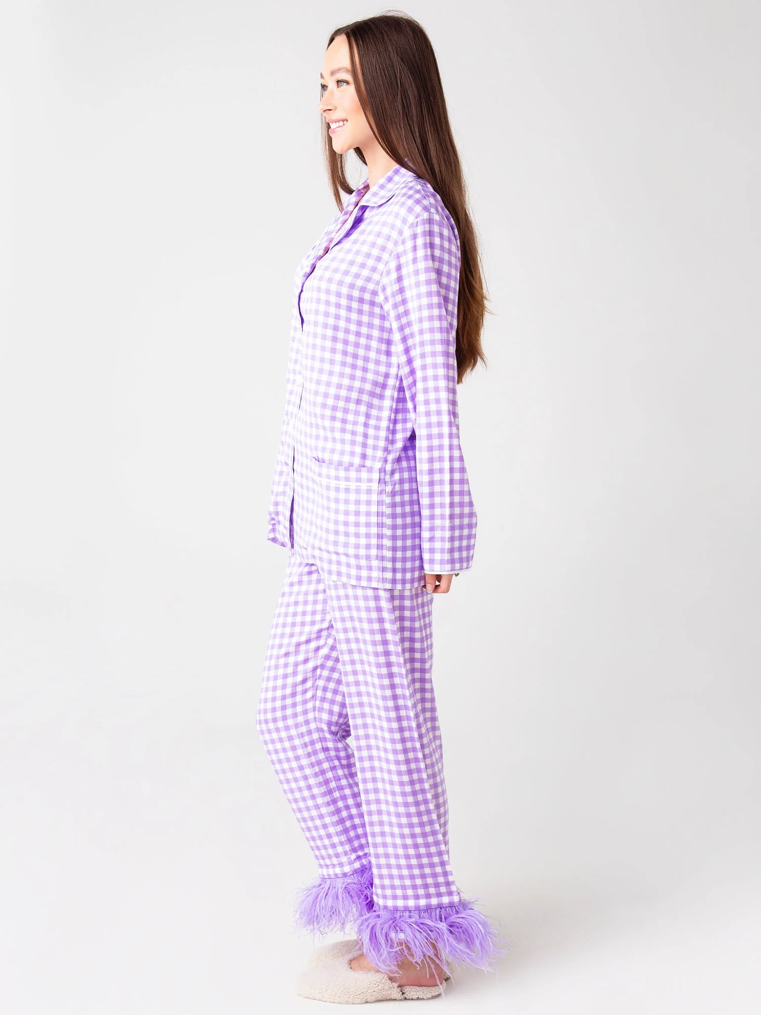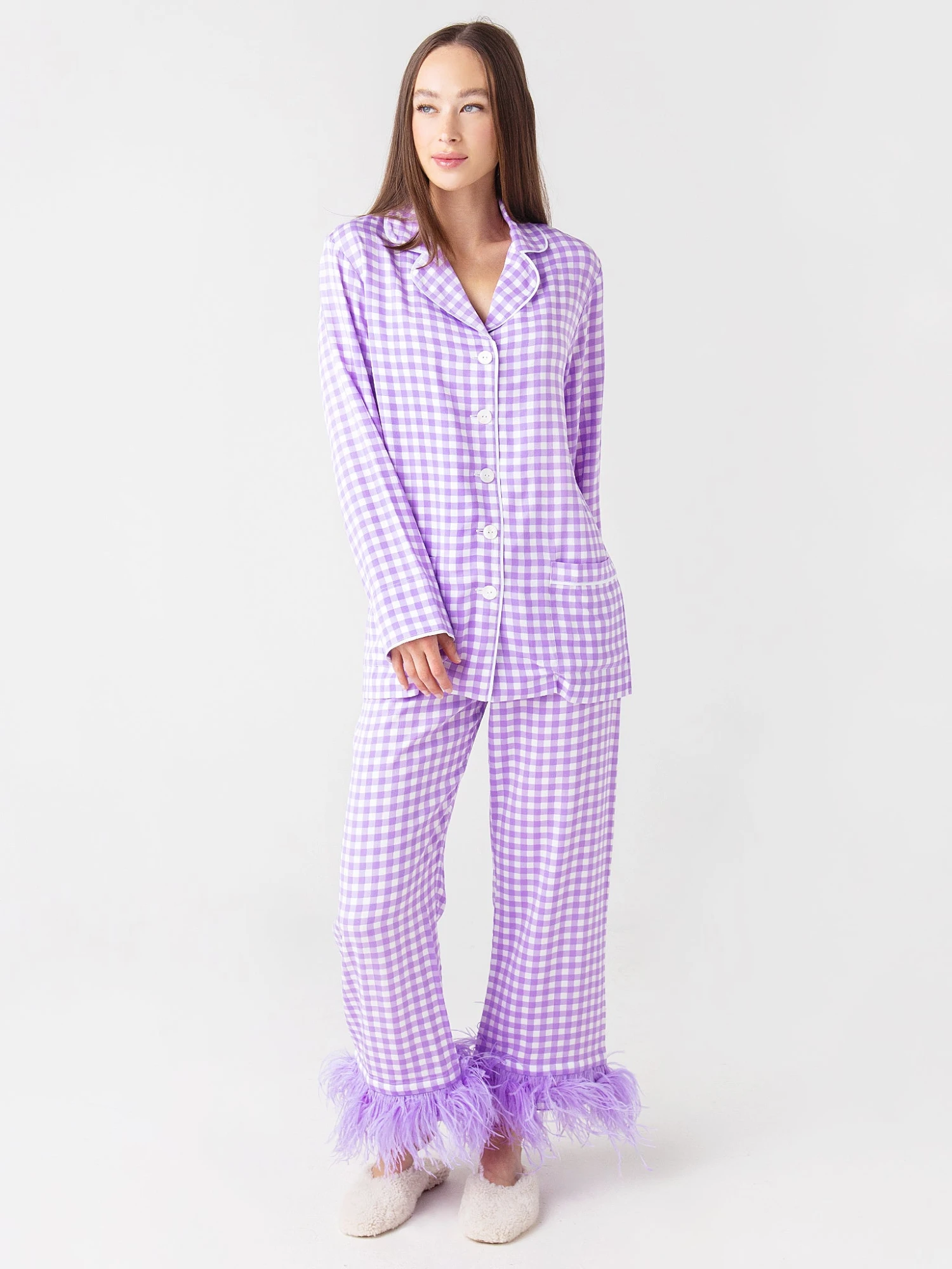 FEATURES:Pajama SetPajama Button-Down TopNotched CollarButton-Down PlacketAll-Over Plaid PrintLong SleeveBarrel CuffsSquare PocketsStraight HemMatching Pajama PantElastic WaistbandDetachable Ostrich Feather Trim100% ViscoseModel is wearing size Small set.Model’s Measurements: Height: 5’10.5″; Bust: 32C; Waist: 25″; Hips: 36″; Dress Size: 4 (US)