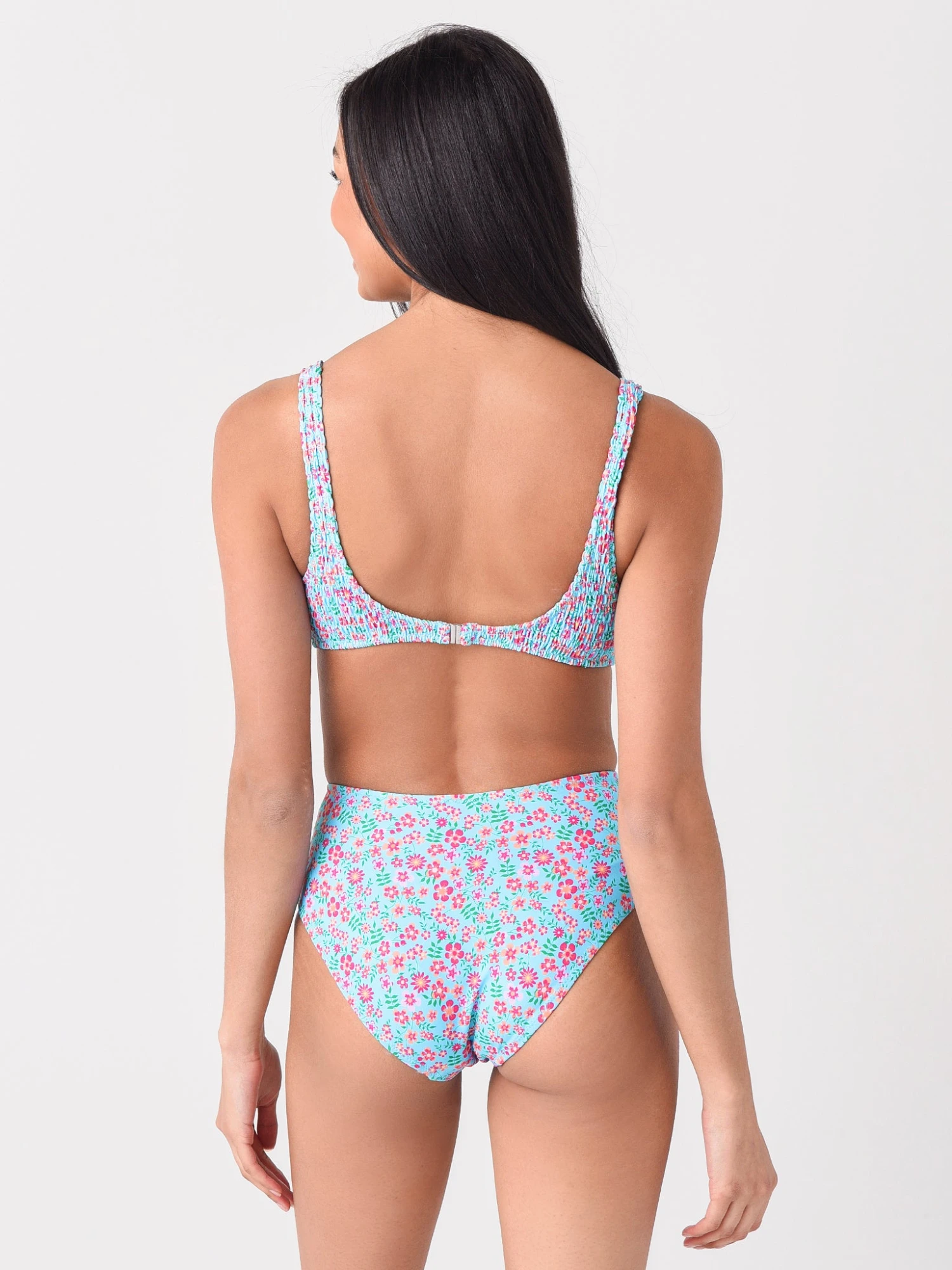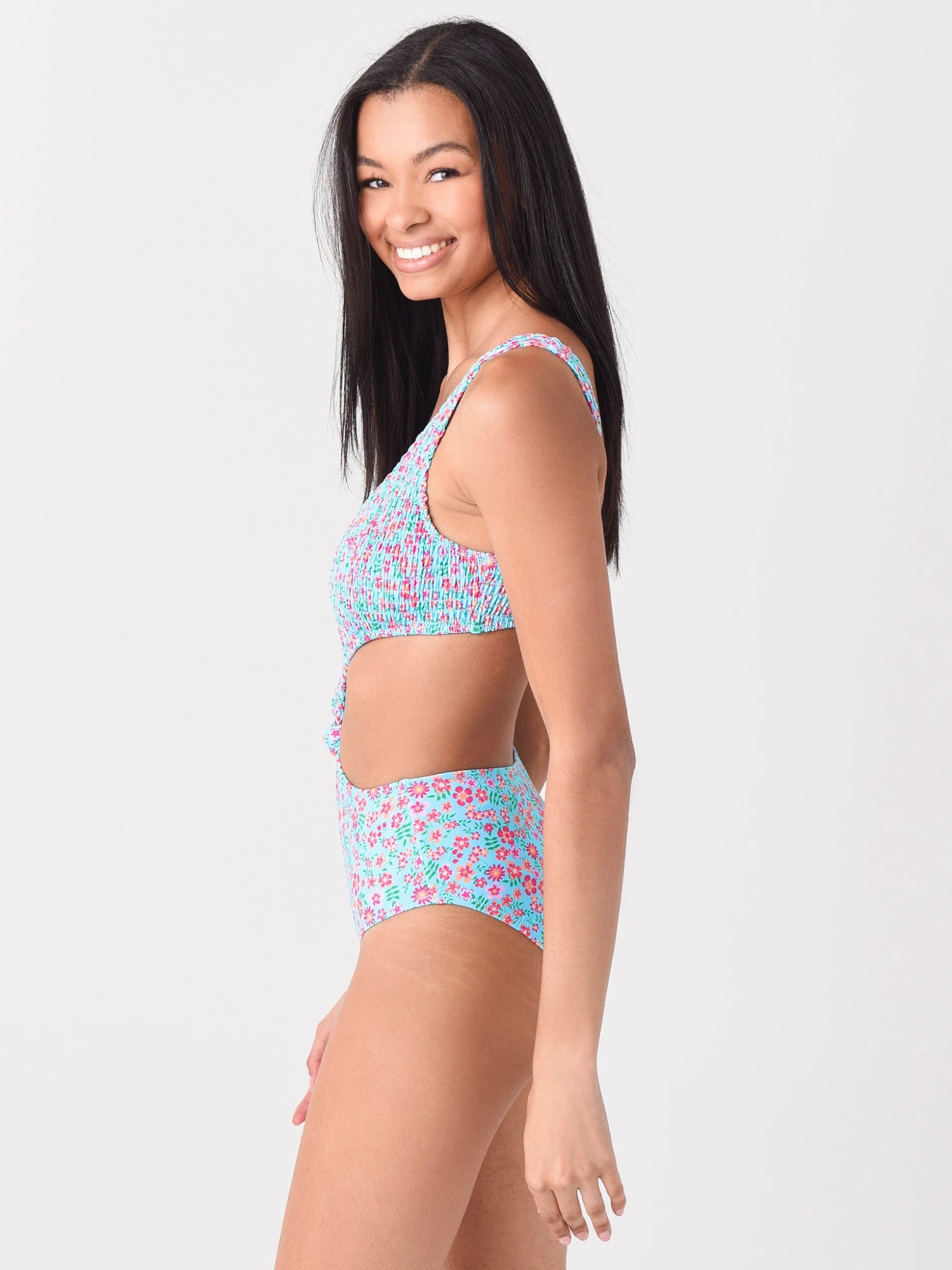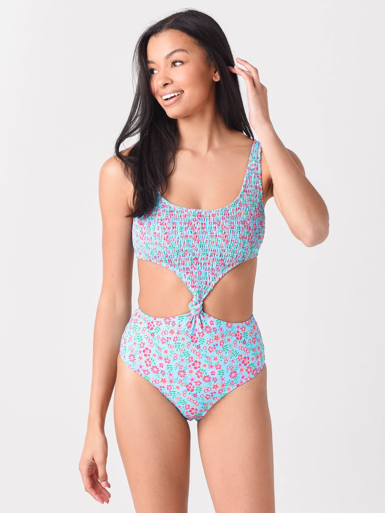 FEATURES:One-Piece SwimsuitScoop NecklineThick Shoulder StrapsCut-Out Knot Detail on Center FrontSmocked FabricationAll-Over FloralHigh LegModerate CoverageFully Lined83% Polyester, 17% Elastane; Lining: 85% Polyamide, 15% ElastaneModel is wearing size Small swimsuit.Model’s Measurements: Height: 5’10”; Bust: 32C; Waist: 25″; Hips: 35″; Dress Size: 0 (US)