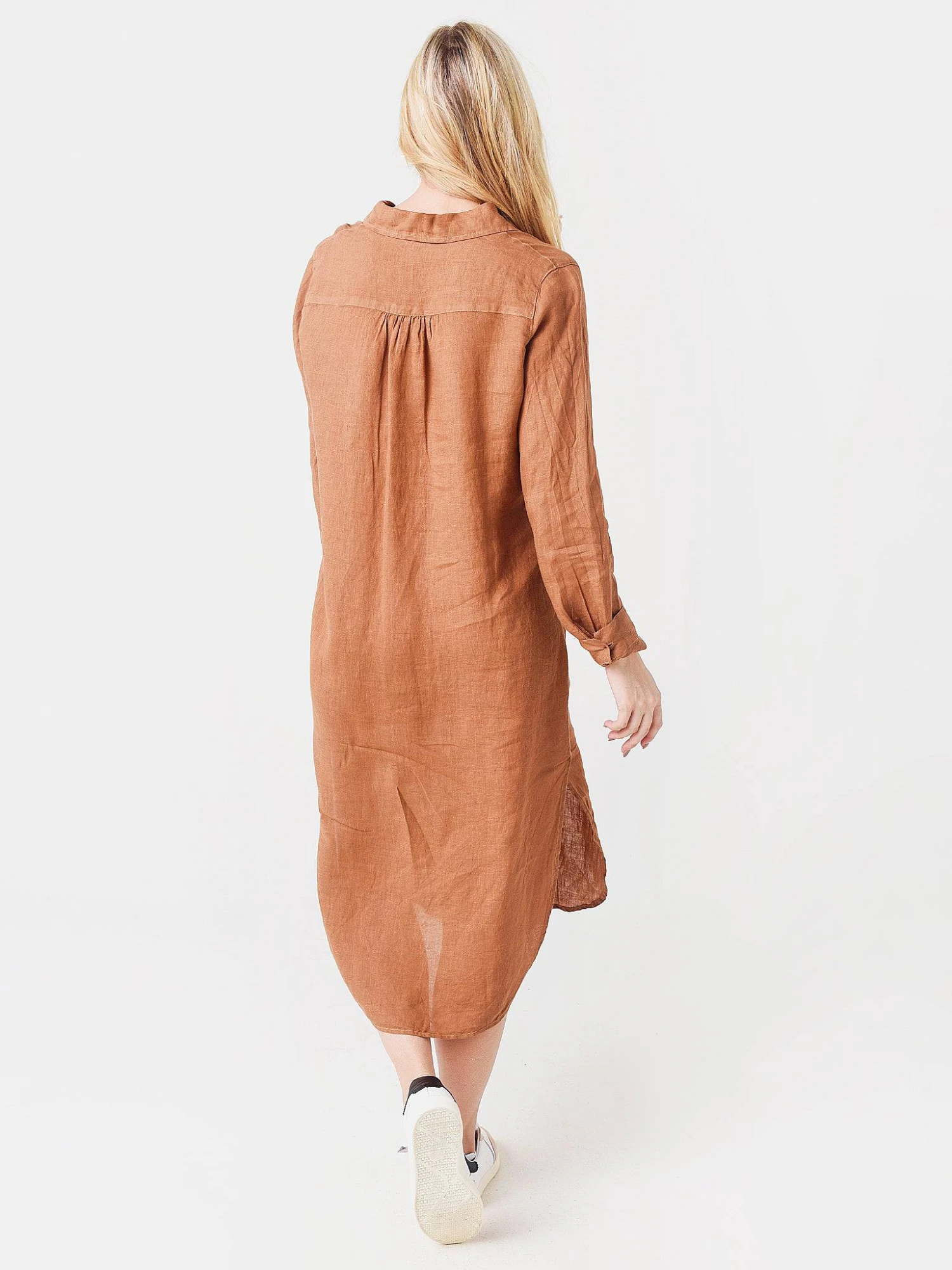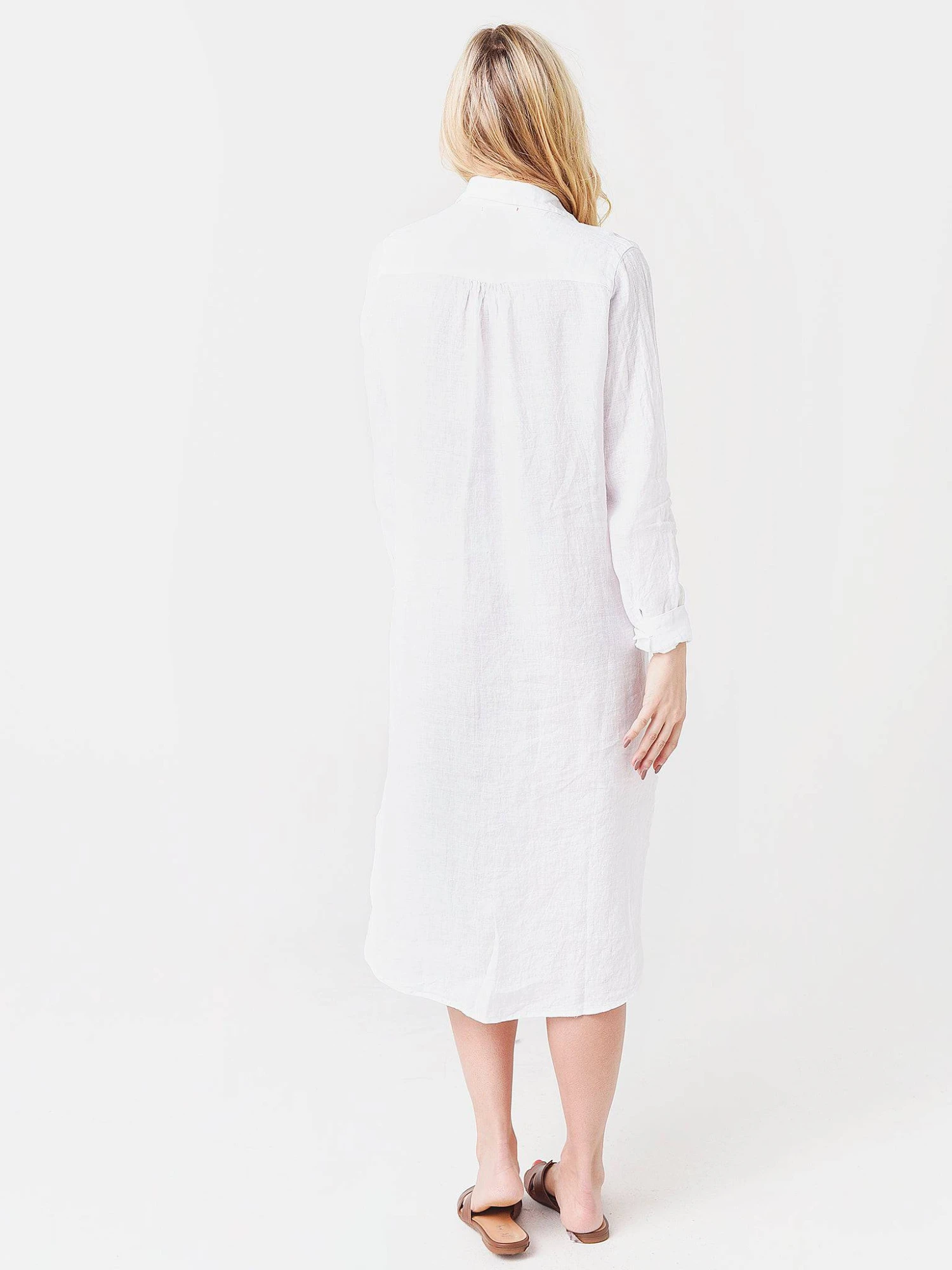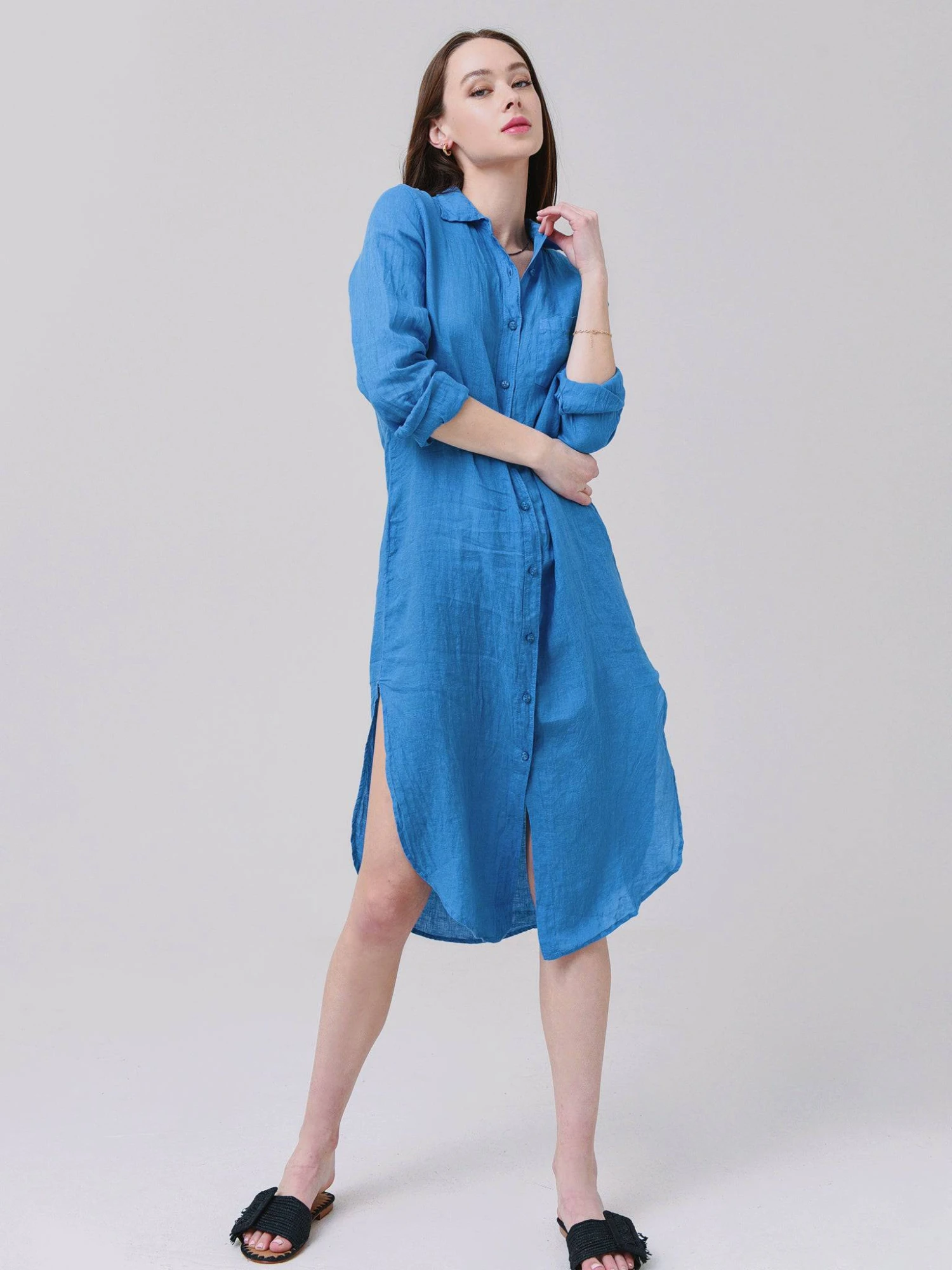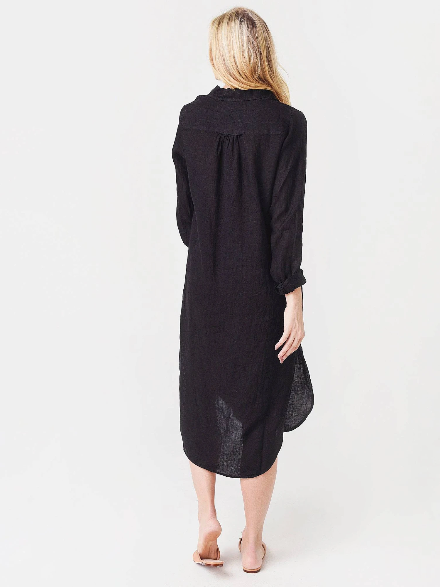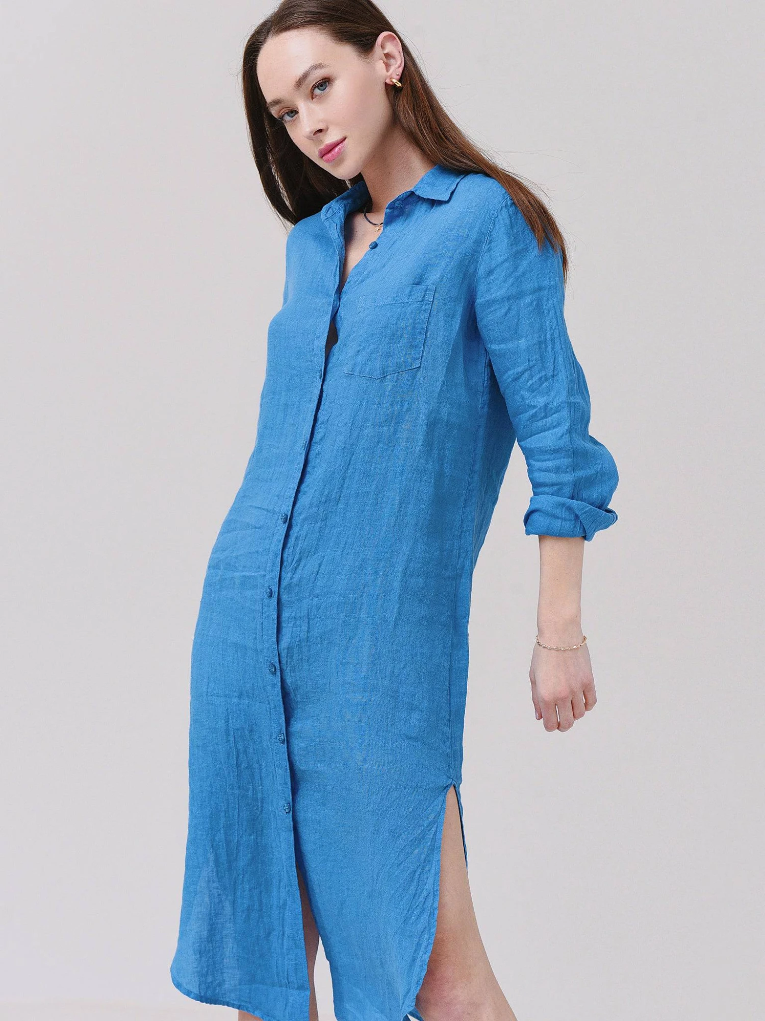 FEATURES:Midi Shirt Dress/Cover-UpSpread CollarLeft Chest PocketLong Sleeve w/ Button CuffsFull Button FrontLightweight Woven Fabrication100% LinenRelaxed FitModel is wearing size Small dress.Atlantic Blue: Model’s Measurements: Height: 5’10.5″ | Bust: 32C | Waist: 25″ | Hips: 36″ | Dress Size: 4 (US)Black, Dark Tan, White: Model’s Measurements: Height: 5’9″ | Bust: 34B | Waist: 26″ | Hips: 37″ | Dress Size: 2-4 (US)
