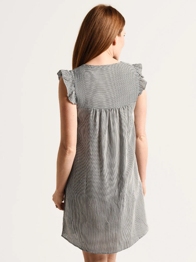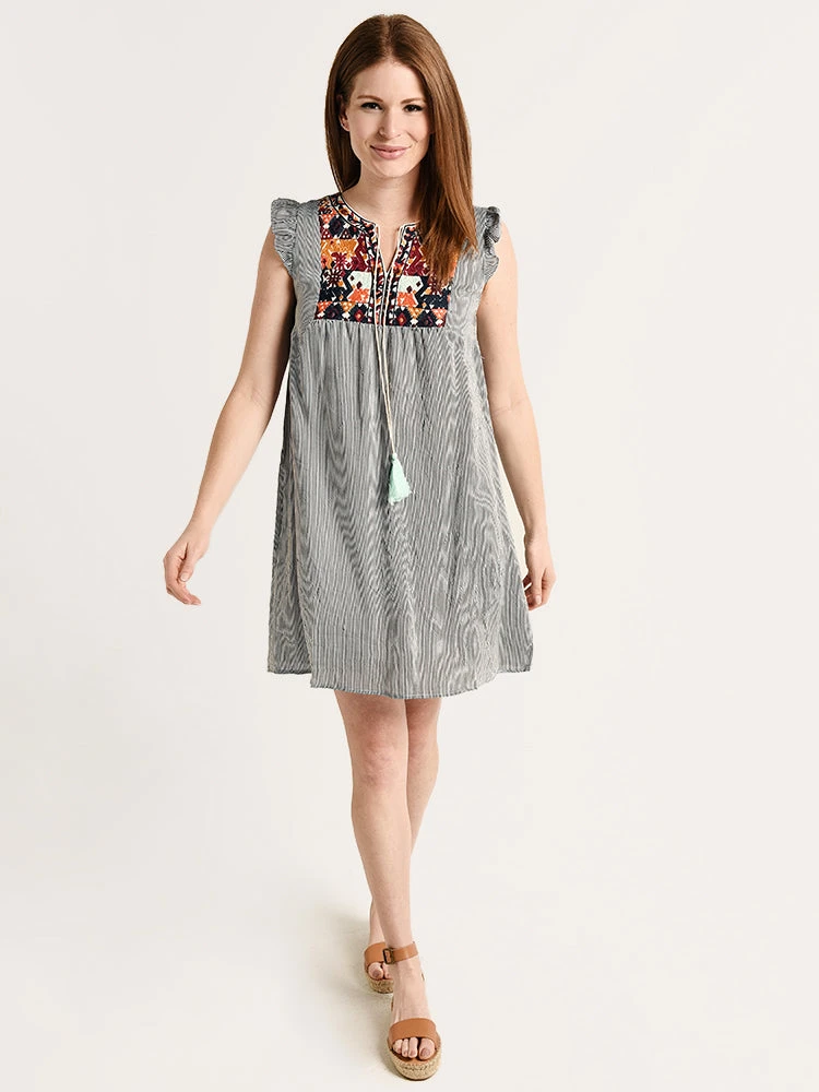 This casual number goes with just about anything, the THML Stripe Embroidered Shift Dress is sure to be one of your faves.