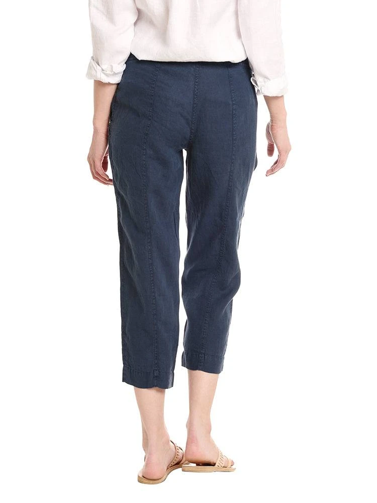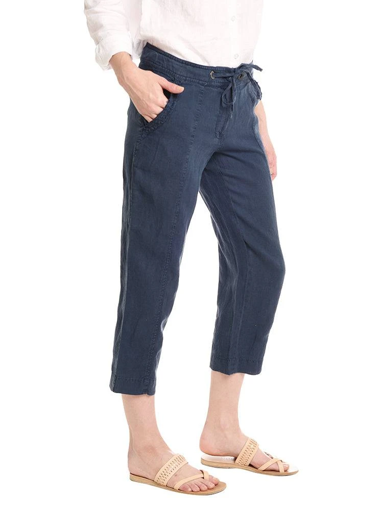FEATURES:Cropped linen pants with lace detailingDrawstring waistZip withbutton closureSide welt pocketsRise, about 10 Inseam, about 24 LinenMachine washImported.Model is wearing size small pant.