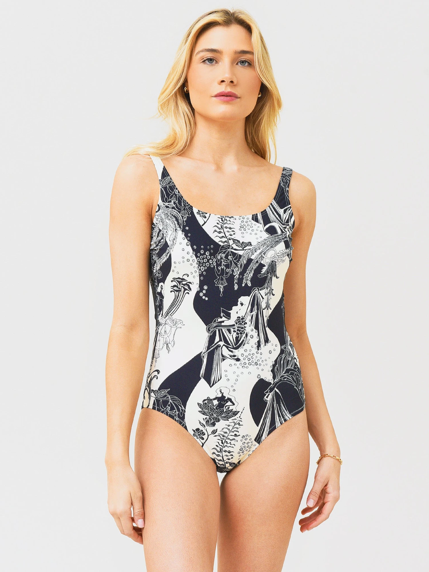Classic one-piece swimsuit with tank-style straps and moderate coverage.