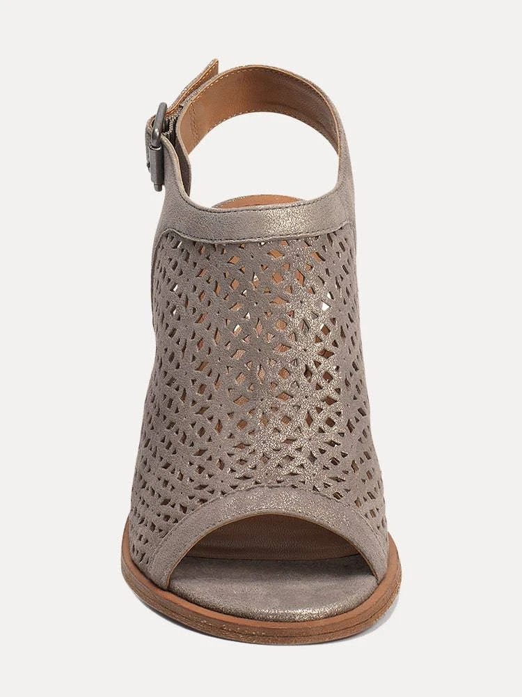 An exclusive perforated pattern lends lacy lightness to Trask’s sleekly sculpted peep-toe silhouette, beautifully crafted of metallic suede with subtle shimmer.