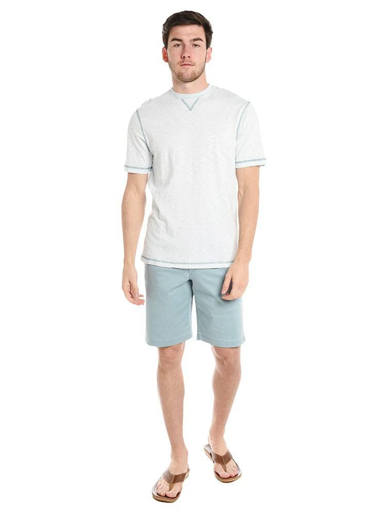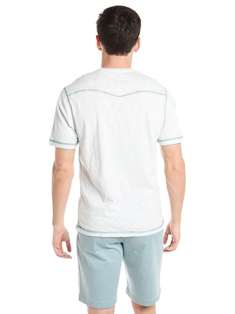 FEATURES:CottonCrew necklineShort sleevescontrast coverlock stitcheswestern back yoke and collegiate VStyled with Tommy Bahama Short Style # T815546#. Model is wearing size 32 short and medium shirt.
