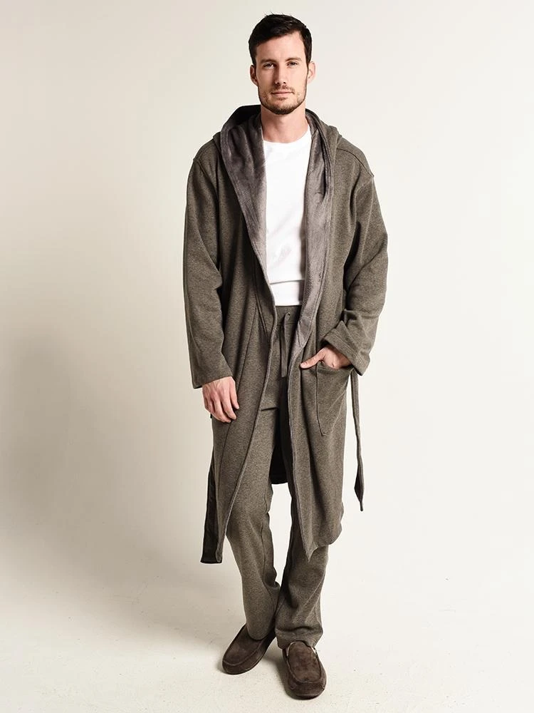 FEATURES:Relaxed FitShawl hoodPatch pocketsSash beltAbove calf lengthUGG flag labelBreathable Fabric Content: 92% Cotton, 8% SpandexPile: 100% PolyesterStyled with UGG pant Style # UA4097M. Model is wearing size M/L robe and size medium pant, See tab above for model’s measurements.