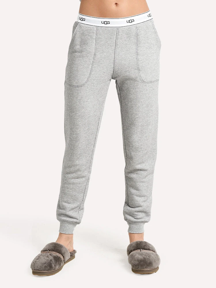 FEATURES:Elastic waistband with UGG repeat logoFront slant pockets Ribbed cuffsJogger style leg 26.75 in center back length60% Cotton, 40% PolyesterStyled with UGG top Style # 1104851 and slippers Style # 1017549. Model is wearing size small pant and top.