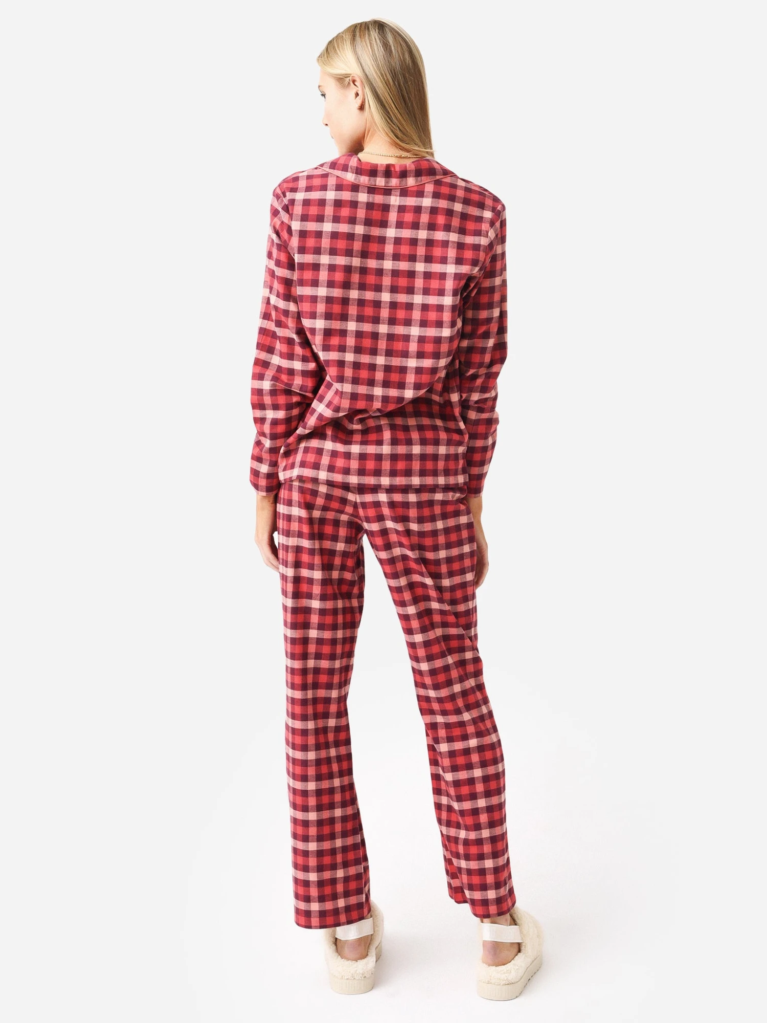 FEATURES:Pajama SetNotch CollarLeft Chest PocketLong SleeveButton-Down FrontStraight HemMatching PantElastic Waistband with DrawstringInseam: 31.75 in.All-Over Plaid PrintSatin PipingSoft Fabrication100% CottonModel is wearing size Small pajama set.Model’s Measurements: Height: 5’10.5″ | Bust: 32B | Waist: 24.5″ | Hips: 36″ | Dress Size: 0-2 (US)