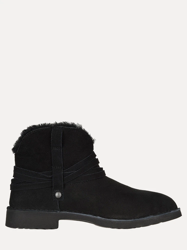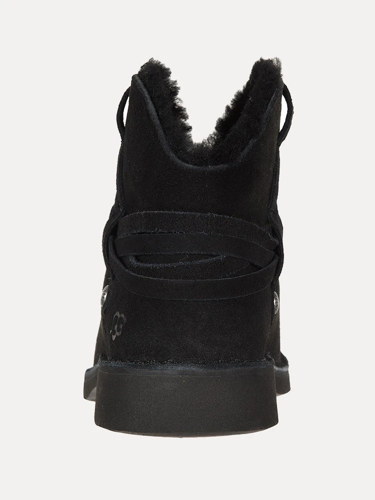 Rich Twinface sheepskin upper with decorative ankle straps and a round toe.